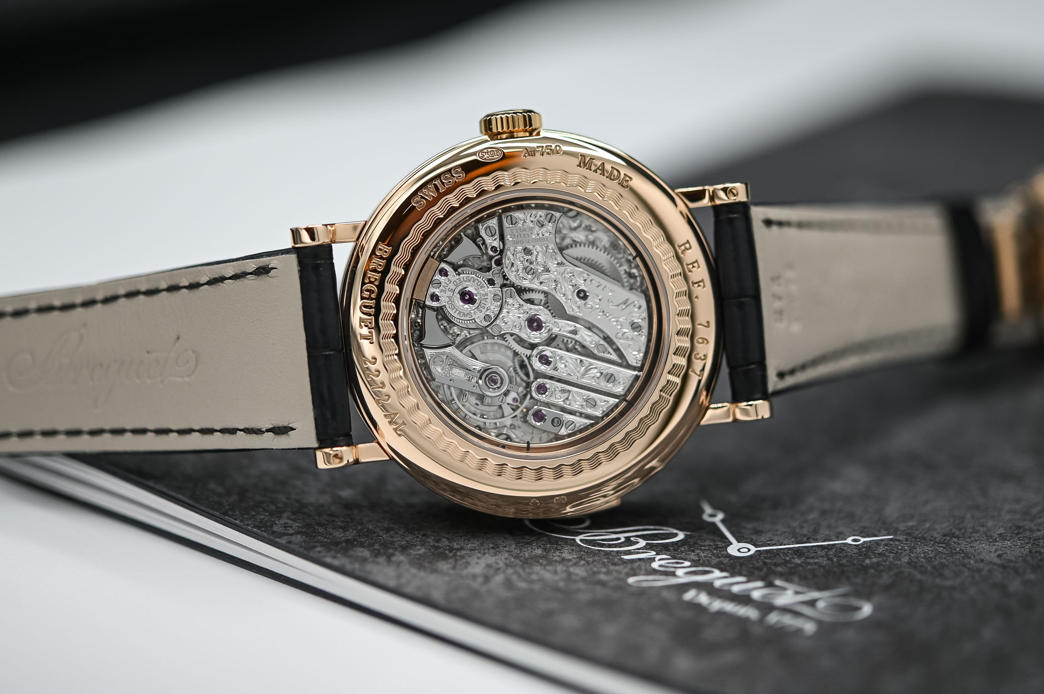 Quick Facts – 42.5mm x 12.25mm – 18k pink gold case, fluted casebands – soldered lugs with screw pins – sapphire crystal front & back – glossy black Grand Feu enamel dial – Breguet numerals – open-tipped Breguet hands – calibre 567.2, in-house – manual winding – 358 components – 18,000vph – 40h power reserve – hours, minutes, minute repeater – black alligator leather strap with pink gold folding clasp – EUR 264,700