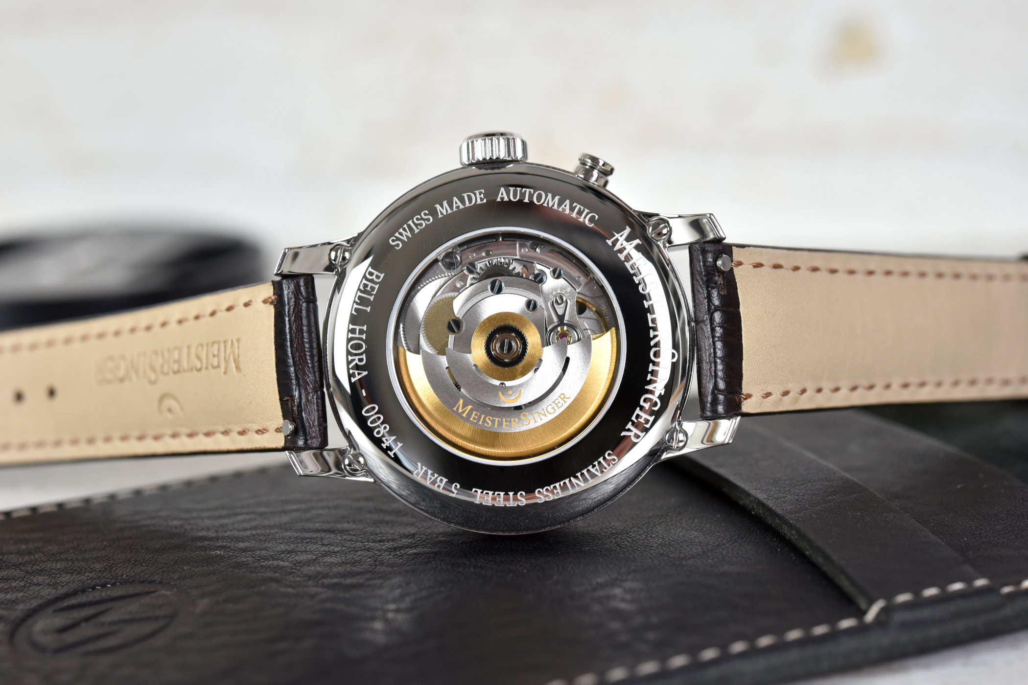Another chiming hour watch on the more affordable end of the spectrum, and one closely tied to the Bel Canto, is the MeisterSinger Bell Hora. The module to make the Bell Hora chime is developed with CW’s Frank Stelzer, a name you’ve just familiarized yourself with. But where the Bel Canto puts its mechanism on full display, the Bell Hora hides it between the dial and movement, resulting in a far more classical watch. The button at two can put the watch in silent mode, but you’d want to hear that chime! Several versions are available, all with a single hand for the time and worn on a leather strap, with prices starting at EUR 4,250.