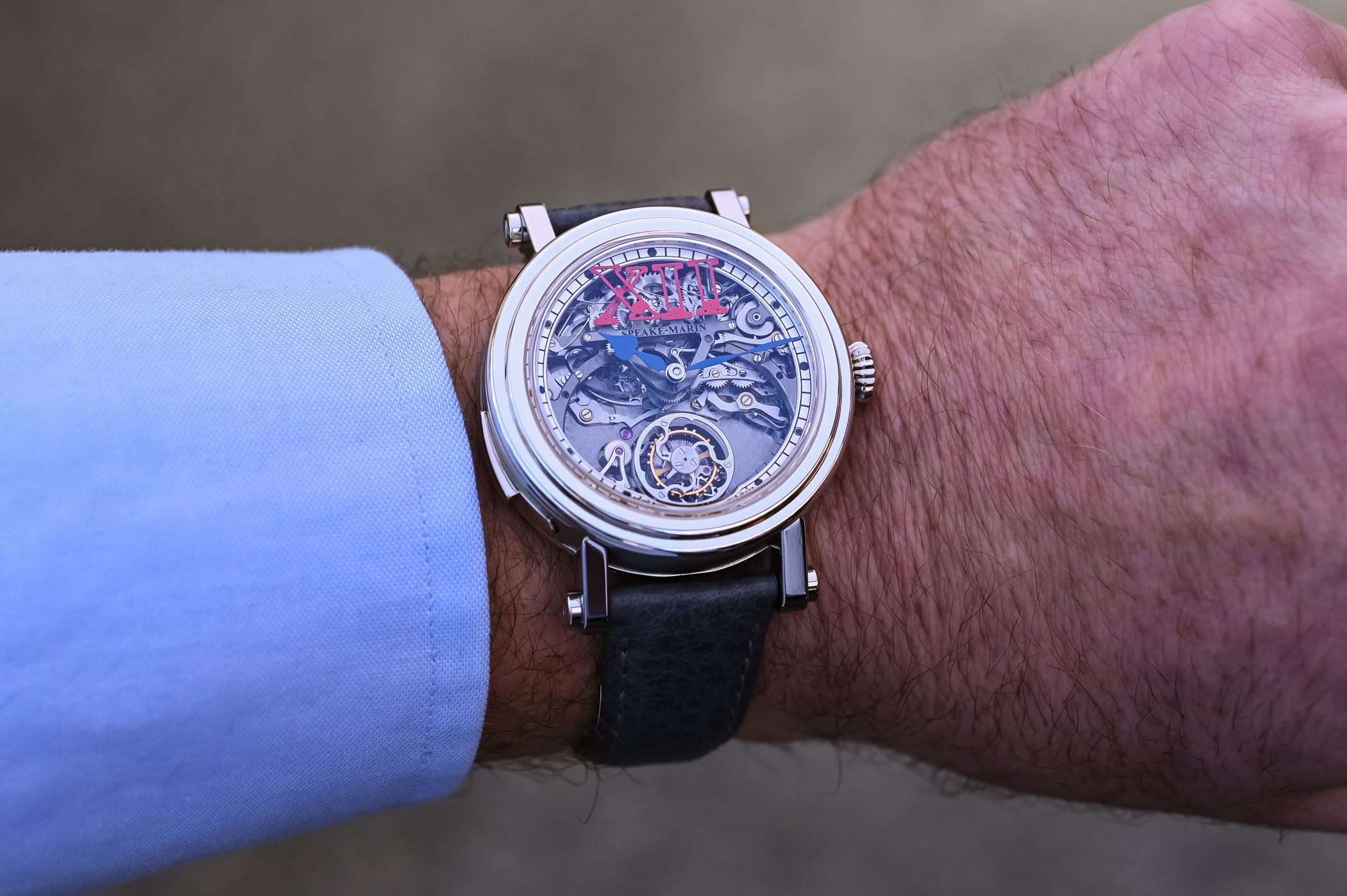 The Speake Marin Minute Repeater Carillon is a truly spectacular piece, exposing all of its mechanics front and back. It packs not one but three highly complex mechanisms into a single watch, as it boasts a minute repeater mechanism, a tourbillon escapement and a mechanical automaton. When you pull on the slider on the side of the case, the watch starts chiming the time, and the red Roman XII starts moving. And it’s not just single chimes for the hours and minutes, but a combination of three hammers hitting multiple gongs. This unique piece comes on a leather strap with a folding or pin buckle, and a price of CHF 360,000.