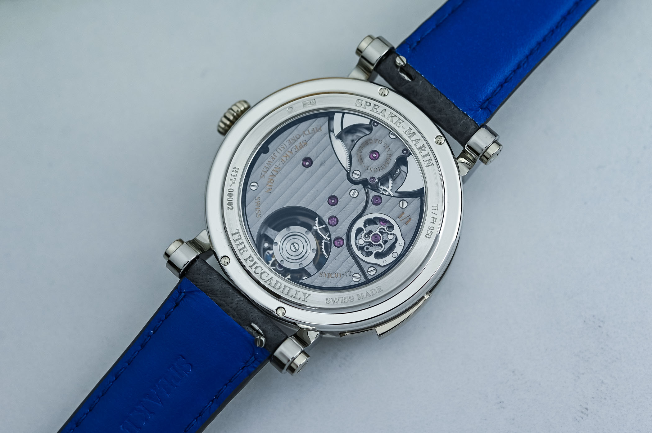 Quick Facts – 42mm x 16mm – Piccadilly case in titanium & platinum – sapphire crystal front & back – 30m water-resistant – openworked dial – carillon repeater mechanism, tourbillon escapement, automaton – spade & whip hands – peripheral hour & minute track – calibre SMAHH-02, manually wound – 536 components – 21,600vph – 72h power reserve – leather strap with folding clasp or pin buckle – unique piece – CHF 360,000