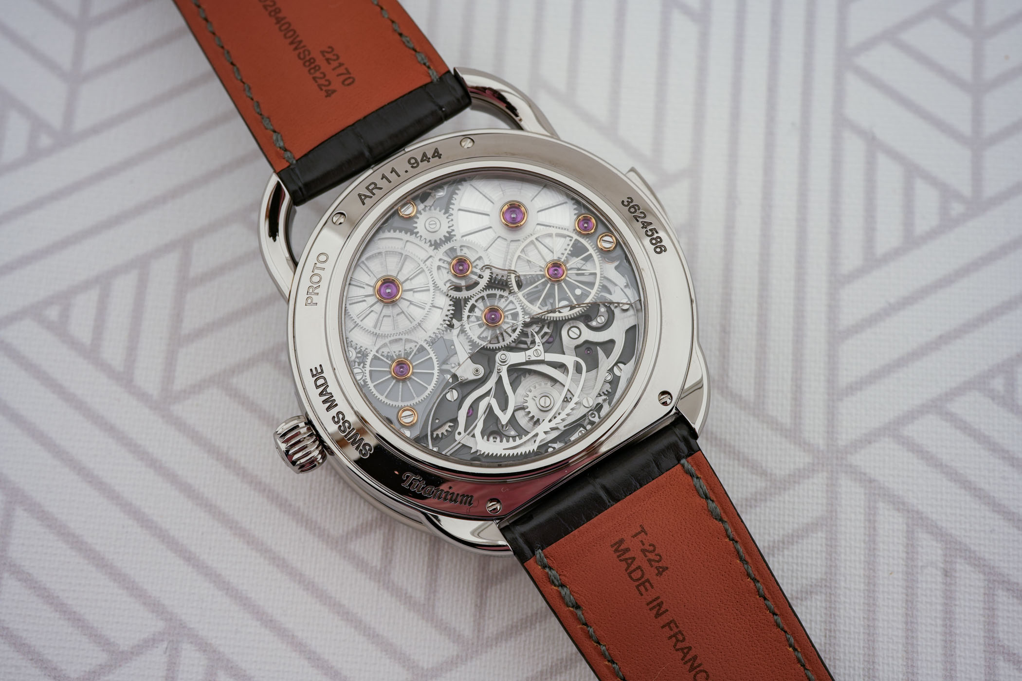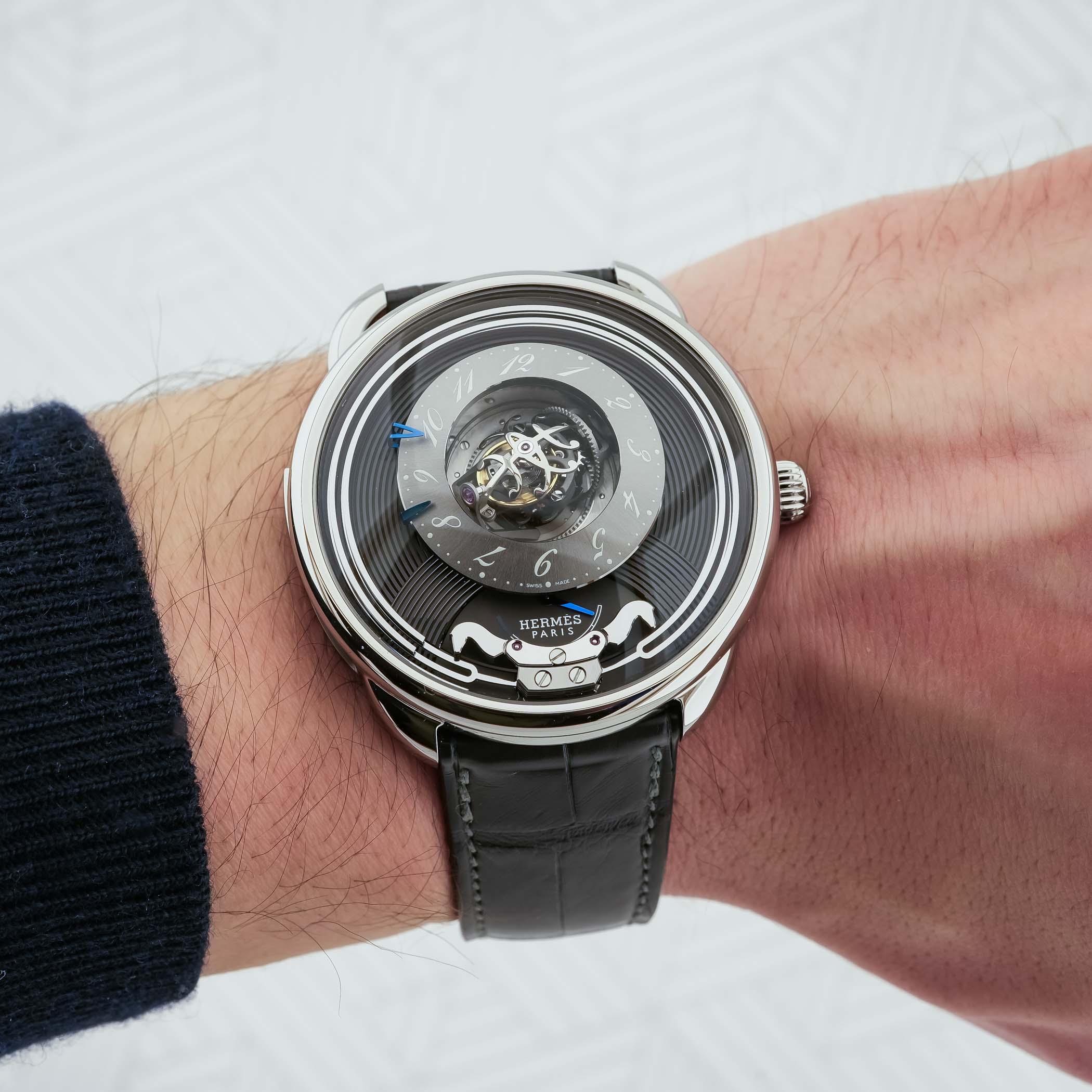 We continue the spectacle with the Hermès Arceay Duc Attelé and its high-beat movement regulated by a triple-axis tourbillon. But that’s not all, as the Hermès Arceau Duc Attelé rings out the time with a pair of horsehead-shaped hammers striking two gongs on demand. Even if you’re not a fan of the equestrian theme, it truly is a sight to behold! Time is read with two floating pointers rotating around a central disc, and the chimes are activated by the slider on the left. It’s limited to 24 pieces in polished titanium or 24 pieces in rose gold with an aventurine dial, both on a leather strap. The price is upon request, which means it’s probably astronomical.