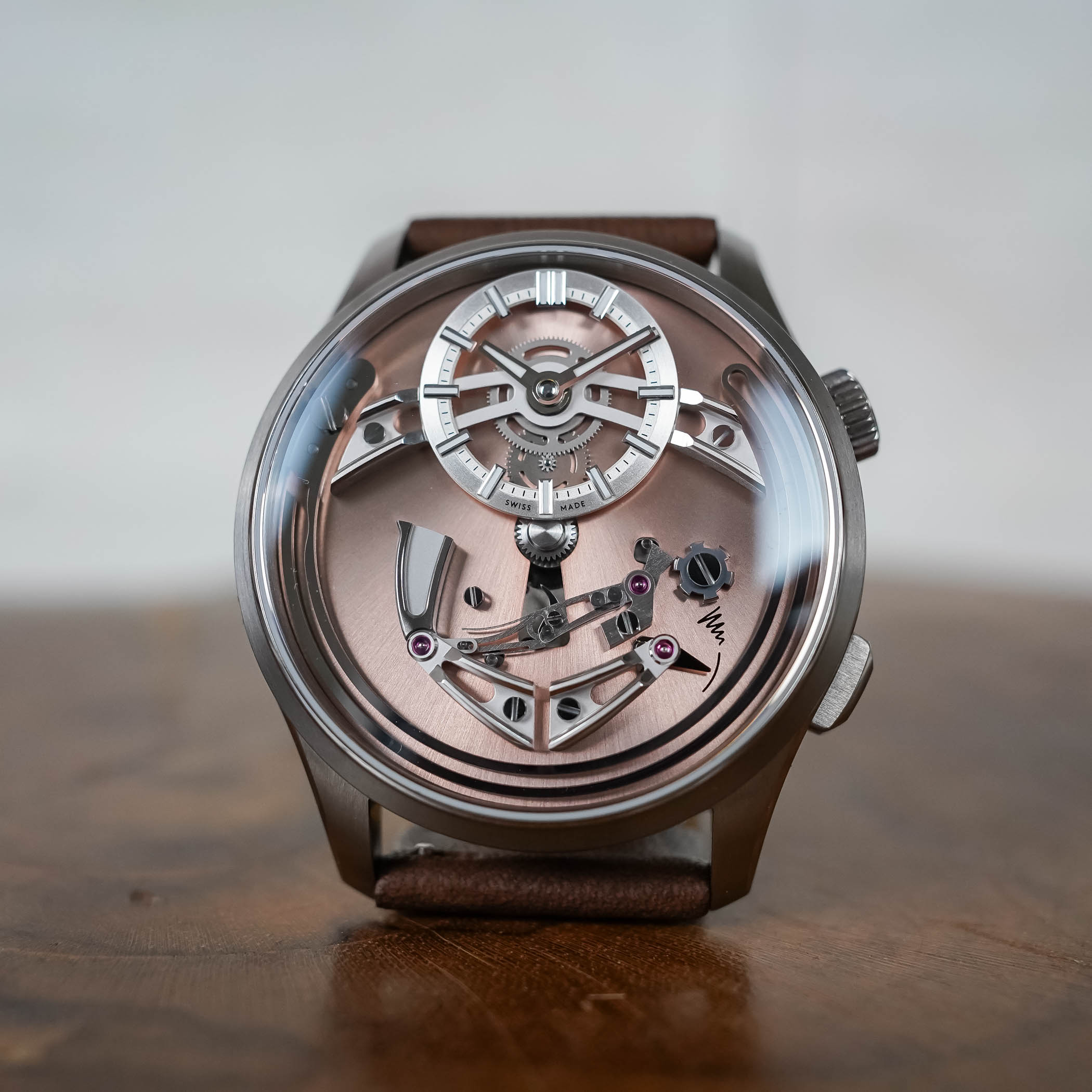 Quick Facts – 41mm x 13mm – grade 5 titanium case – domed sapphire crystal – stamped caseback with sound motif – silent-mode pusher – 30m water-resistant – rosa gold (salmon) sunray-brushed base dial – suspended hour & minute dial with SLN inserts for hands & markers – suspended chiming mechanism – Selltia SW200-1 base with in-house FS01 chiming module – grade 2 titanium bracelet or leather strap – EUR 4,095 (leather strap) or EUR 4,545 (titanium bracelet)
