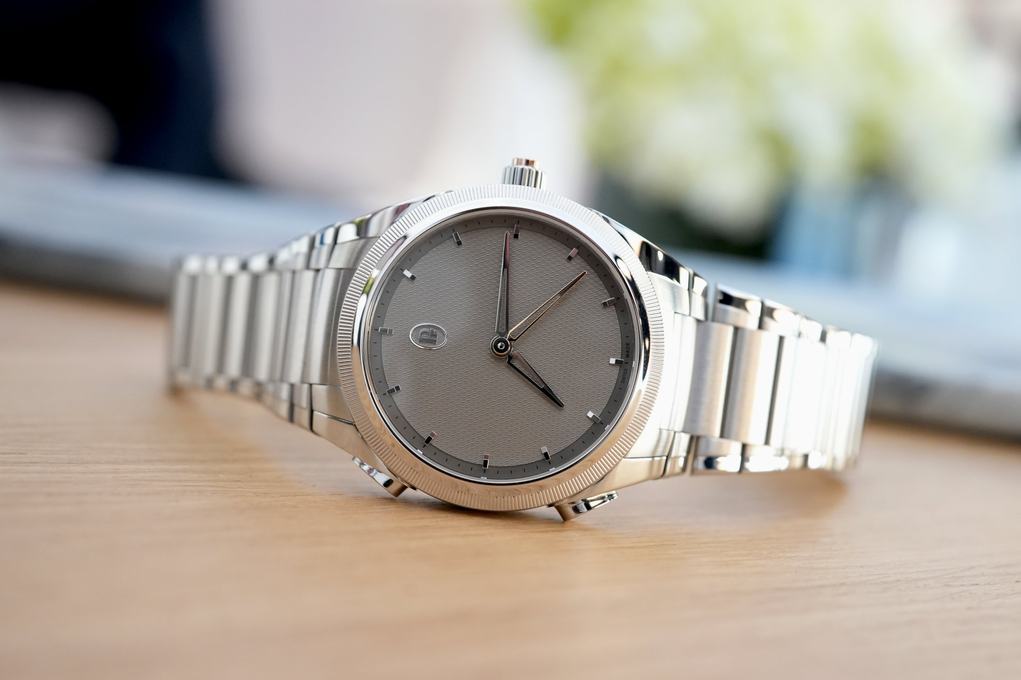 Quick Facts – 40.3mm x 9.2mm – stainless steel ‘City’ case, brushed & polished – sapphire crystal front & back – crown with crown-guards – 50m water-resistant – grey brushed ‘Ripples’ dial – rhodium-plated heart-shaped hands – applied hour indices – small seconds sub-dial – framed date window – calibre SMA03-TD, automatic with micro-rotor – 28,800vph – 52h power reserve – integrated stainless steel bracelet with folding buckle – limited to 250 pieces per year – CHF 23,900