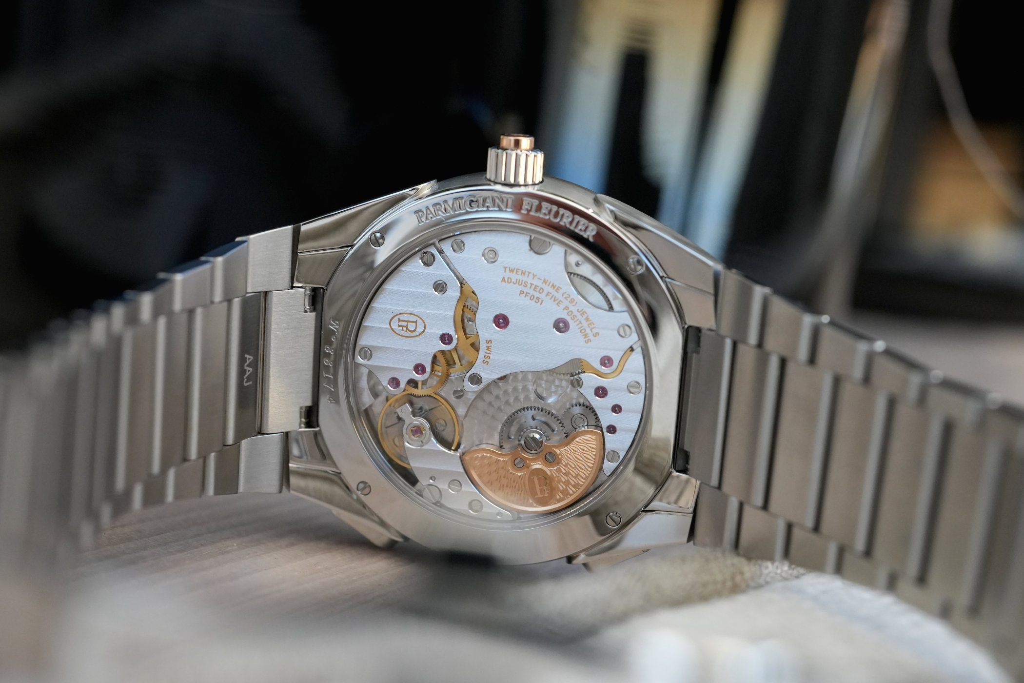 Quick Facts – 40mm x 10.7mm – stainless steel, polished & brushed – knurled platinum bezel – sapphire crystal front & back – crown with integrated pusher – 2 pushers to advance the minute hand – 60m water-resistant – sand grey dial with guilloché pattern – applied indices – central hour and minute hands – secondary minute hand in gold for rattrapante function – calibre PF052, micro-rotor automatic – 271 components – 21,600vph – 48h power reserve – integrated steel bracelet – CHF 28,000