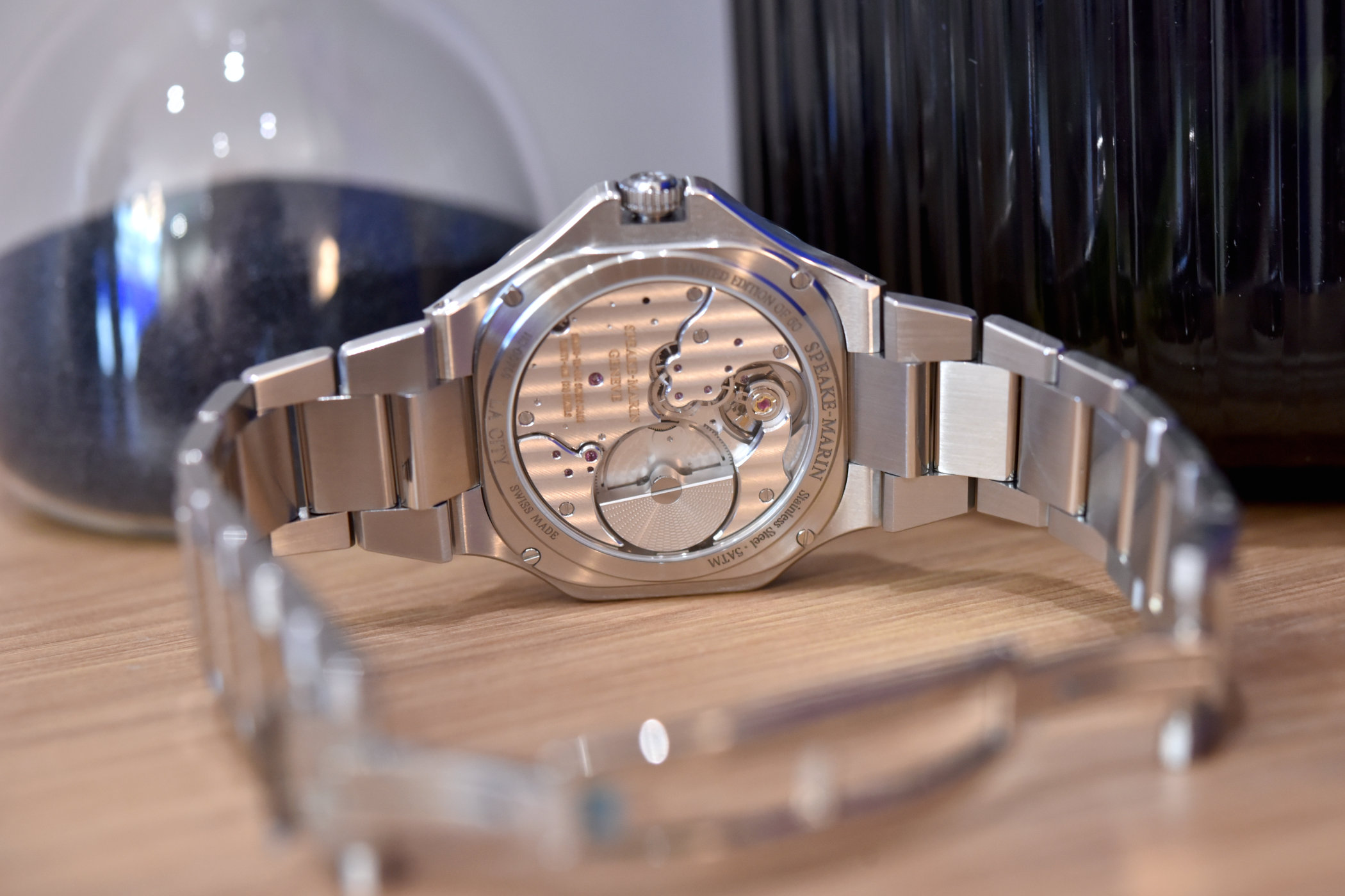 One of the highlights by Chopard this year has to be this Alpine Eagle 41 XPS. That’s not just because of the very handsome ‘Monte Rosa’ salmon pink Eagle’s eye dial but also its extra-thin 8mm case. Finished in Lucent Steel A223, a special alloy that shines brighter than regular steel, this is really a stand-out watch. The case and bracelet are almost uniform in thickness, which greatly adds to the comfort! On the reverse side, you get a full view of the Chopard L.U.C. 96.40-L, driven by a gold micro-rotor to provide a healthy 65 hours of power reserve. The Alpine Eagle 41 XPS retails for EUR 24,400.