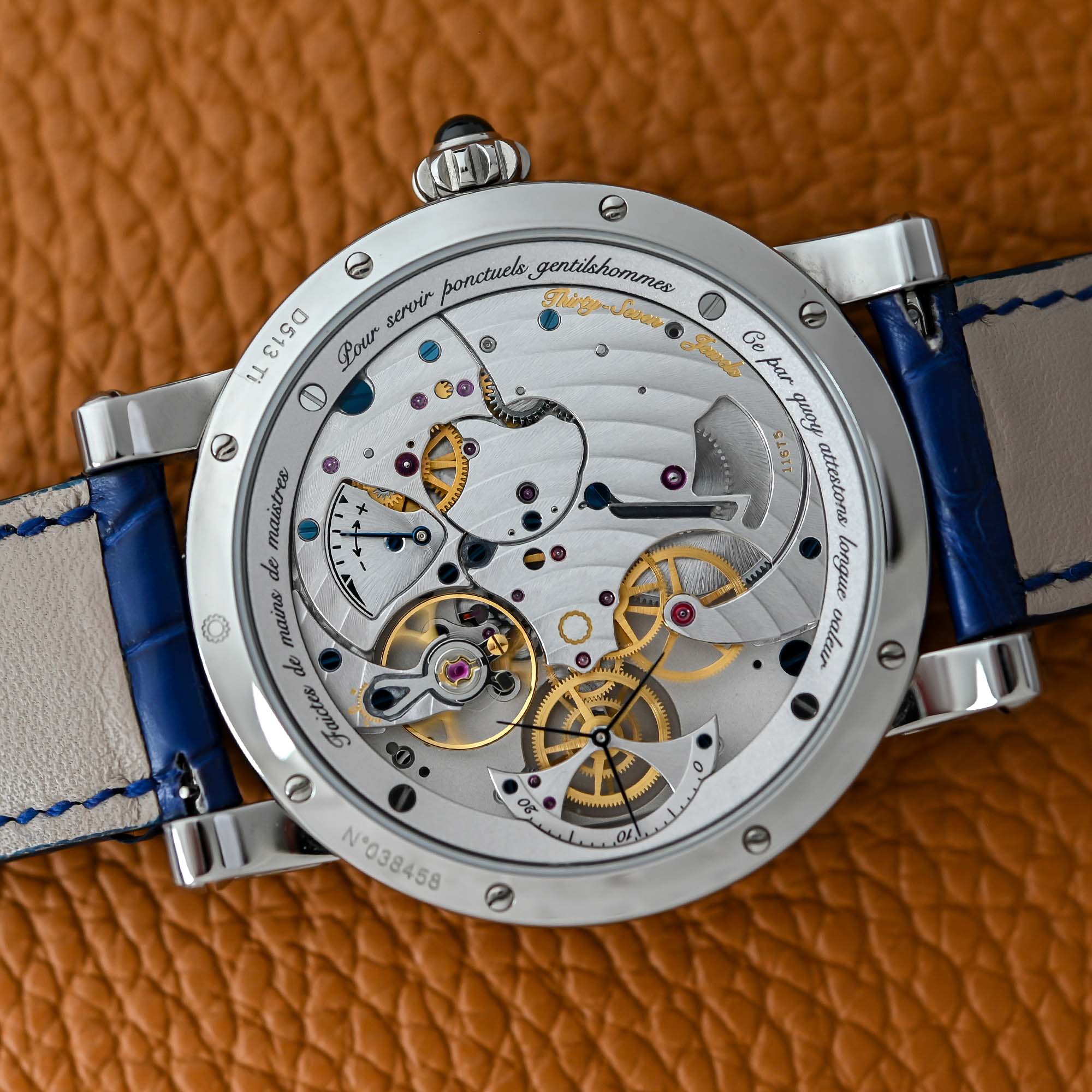 Quick Facts – 42mm x 12.6mm – grade 5 titanium case, polished – fluted crown with sapphire – sapphire crystal front & back – 30m water-resistance – lacquered salmon dial – jumping hours at 3′ – retrograde minutes indication – calibre 13DM02-AIHSMR (based on Virtuoso II), in-house – manual winding – 21,600vph – 5-day power reserve – double coaxial seconds & power reserve on back – blue alligator leather strap with titanium buckle – limited to 30 pieces – CHF 61,800