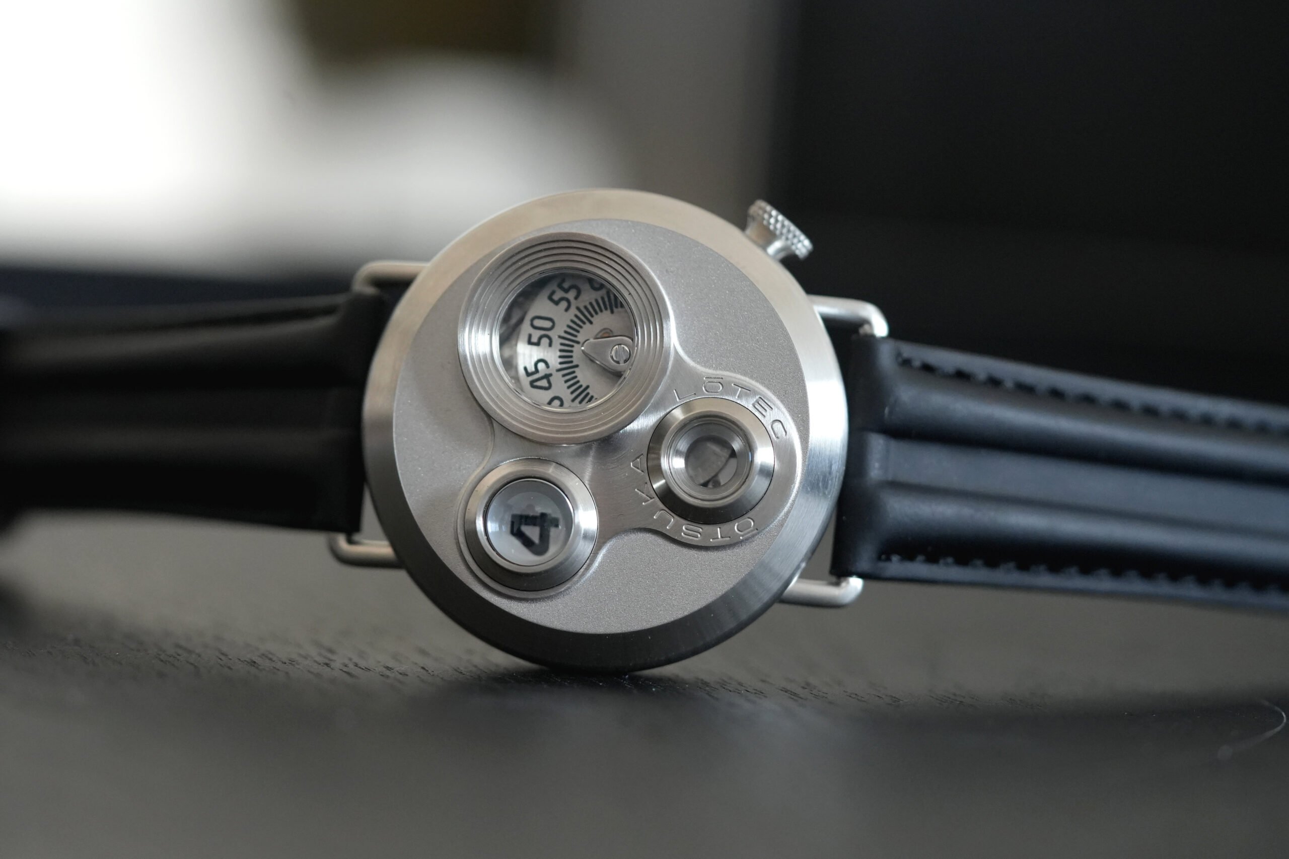 Coming from the land of the rising sun, Otsuka Lotec is the work of self-taught watchmaker Jiro Katayama. The brand has made quite a stir in the community with its fascinating industrial designs. The Model No. 7.5 is one of the more outspoken watches, inspired by vintage 8mm cameras. The time indications are spread across three individual ‘eyes’: one for the jumping hours, one for the rotating minutes, and one for the running seconds. It’s powered by a Miyota 82S5 automatic movement, with an in-house module on top. It’s available in Japan only (for the moment) for JPY 325,000 incl. VAT (which roughly equates to EUR 2,160).