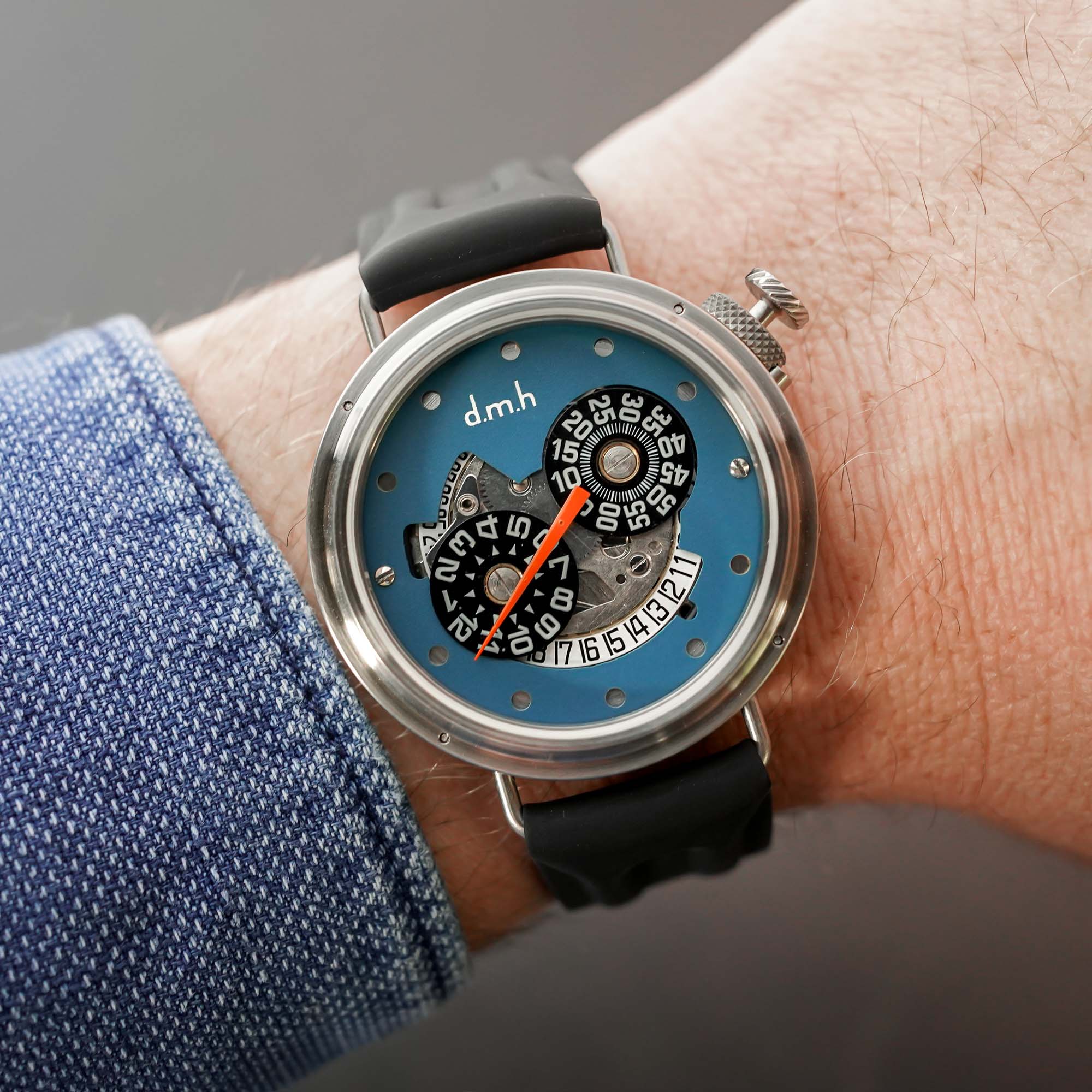 Quick Facts – 39.6mm x 12mm – stainless steel case, brushed – wire lugs – unique Dingemans crown – sapphire crystal front & back – 30m water-resistant – blue lacquered dial, in-house – jumping hour & revolving minute discs – orange lacquered seconds hand – date disc – NOS Tenor Dorly 1376, fully serviced – automatic winding – 21,600vph – 48h power reserve – signed rotor – leather or rubber strap with pin buckle – unique pieces, made to order – starting price of EUR 2,795