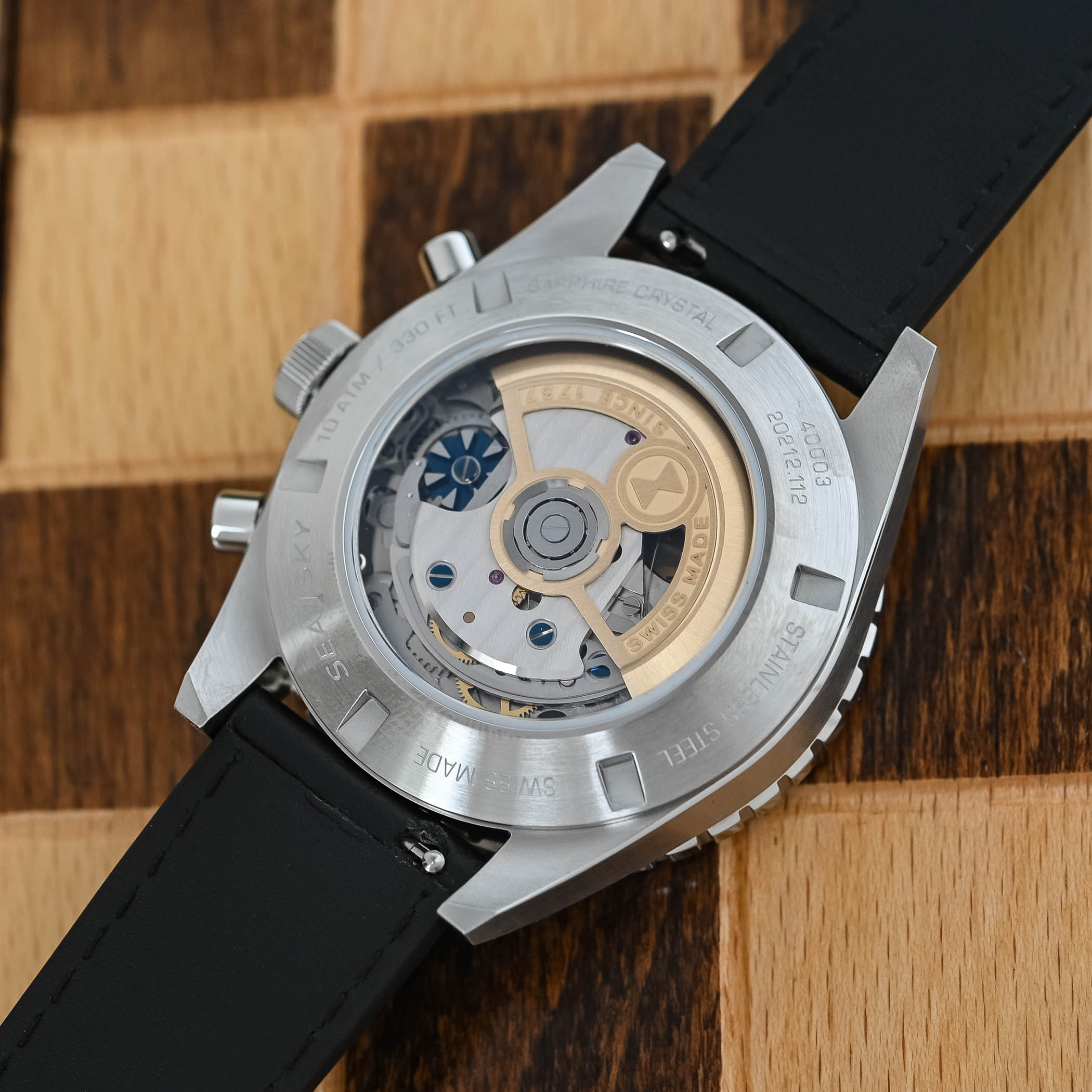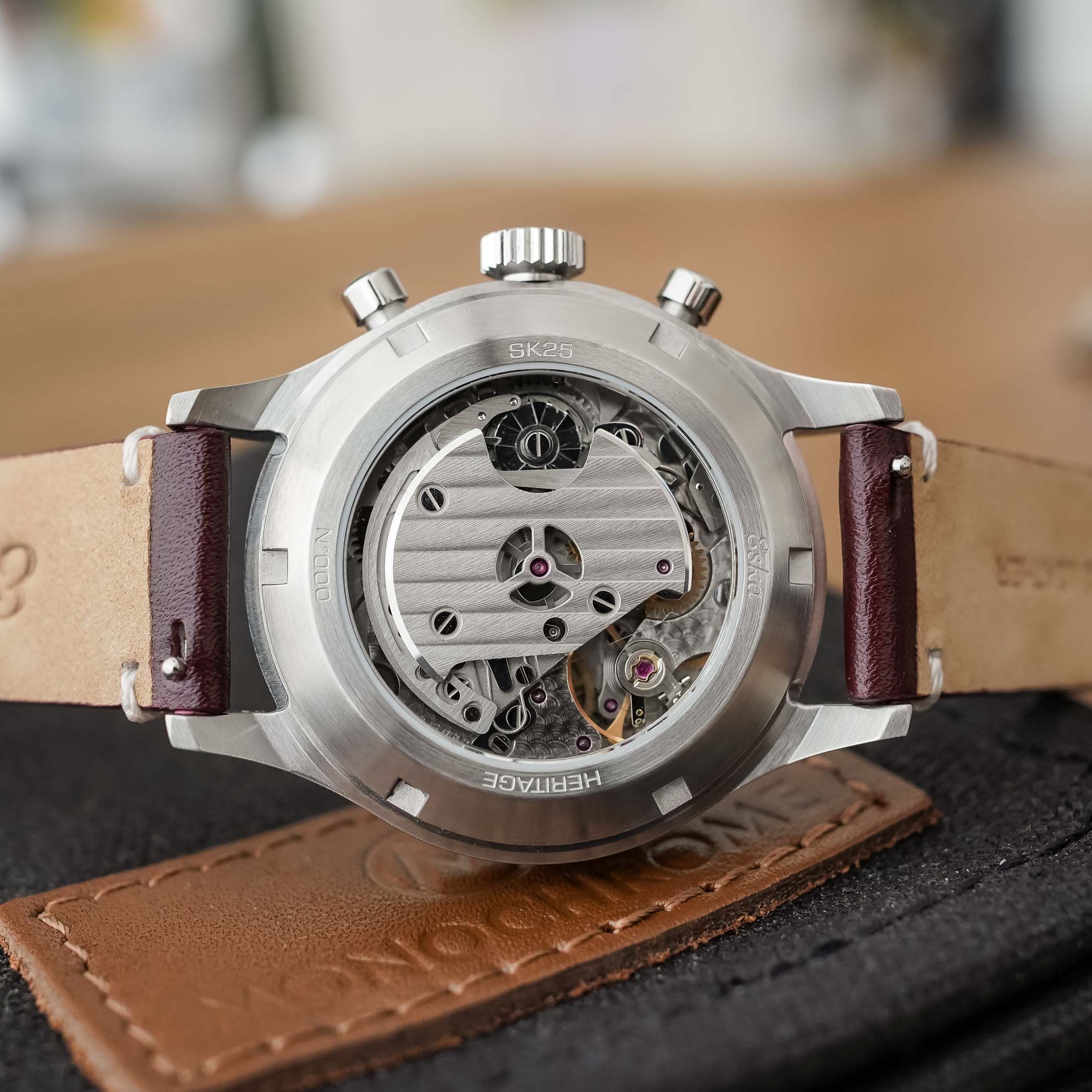 Quick Facts – 38mm x 13.95mm – stainless steel case, brushed & polished – sapphire crystal front & back – knurled crown, pump-style pushers – 50m water-resistant – black or cream dial – printed vintage font numerals – Old Radium Super-LumiNova – La Joux-Perret L113, manually wound – column-wheel chronograph – 28,800vph – 60h power reserve – leather strap or beads-of-rice bracelet with quick-release pushpins – EUR 2,075 excl. VAT
