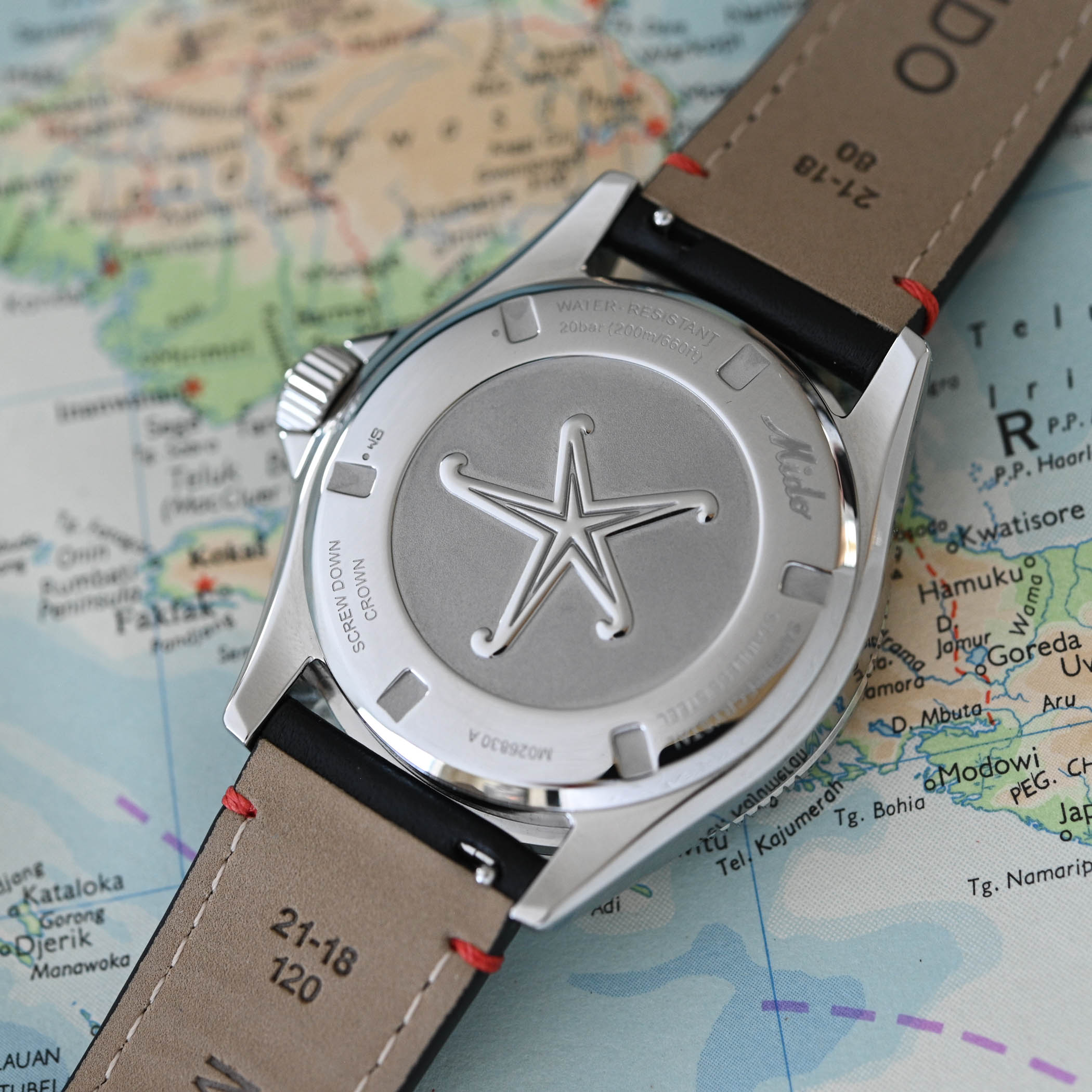 Quick Facts – 40.5mm x ~47mm – stainless steel case – box sapphire crystal – screw-down crown and caseback – 200m water resistance – unidirectional rotating bezel with engraved cities (black aluminium insert) – silver velour dial with black/red chequered accents – Super-LumiNova hands and markers – day-date at 3 o’clock – automatic Mido Calibre 80 (ETA C07.621 base, Nivachron spring, 21,600 vph, 80h power reserve) – black Bund-style strap with removable under-layer – CHF 850 excl. tax / EUR 990 incl. tax
