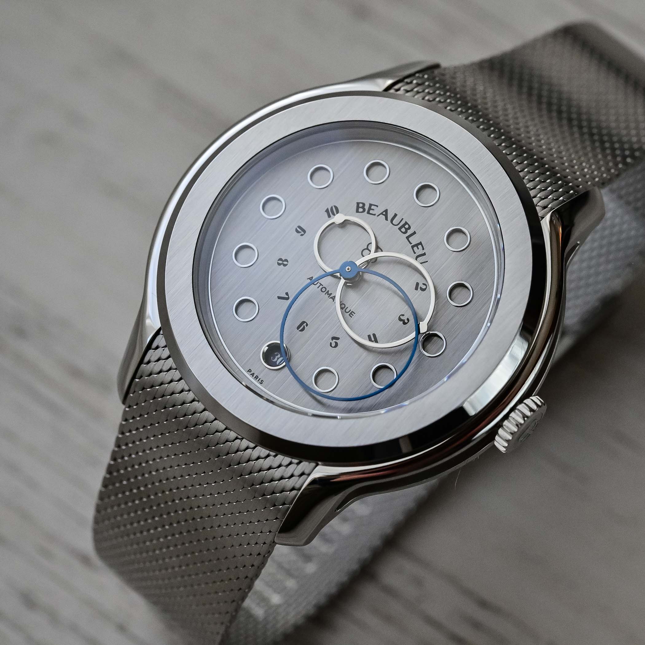 Microbrands tend to tap into different sources for creativity compared to large corporate brands, as this Beaubleu Vitruve Date Steel perfectly demonstrates. The small French brand has created a very distinct look with a vertically brushed steel dial with circular indices and hands. The bottom circle shows the date, and the overall combination is fun and original. Ticking away inside the 39mm by 9.5mm steel case is the Miyota 9015 automatic movement, visible through the caseback. You have a choice between a leather strap for EUR 820 or a mesh steel bracelet for EUR 950 (go for that one!). The model is limited to 288 pieces.