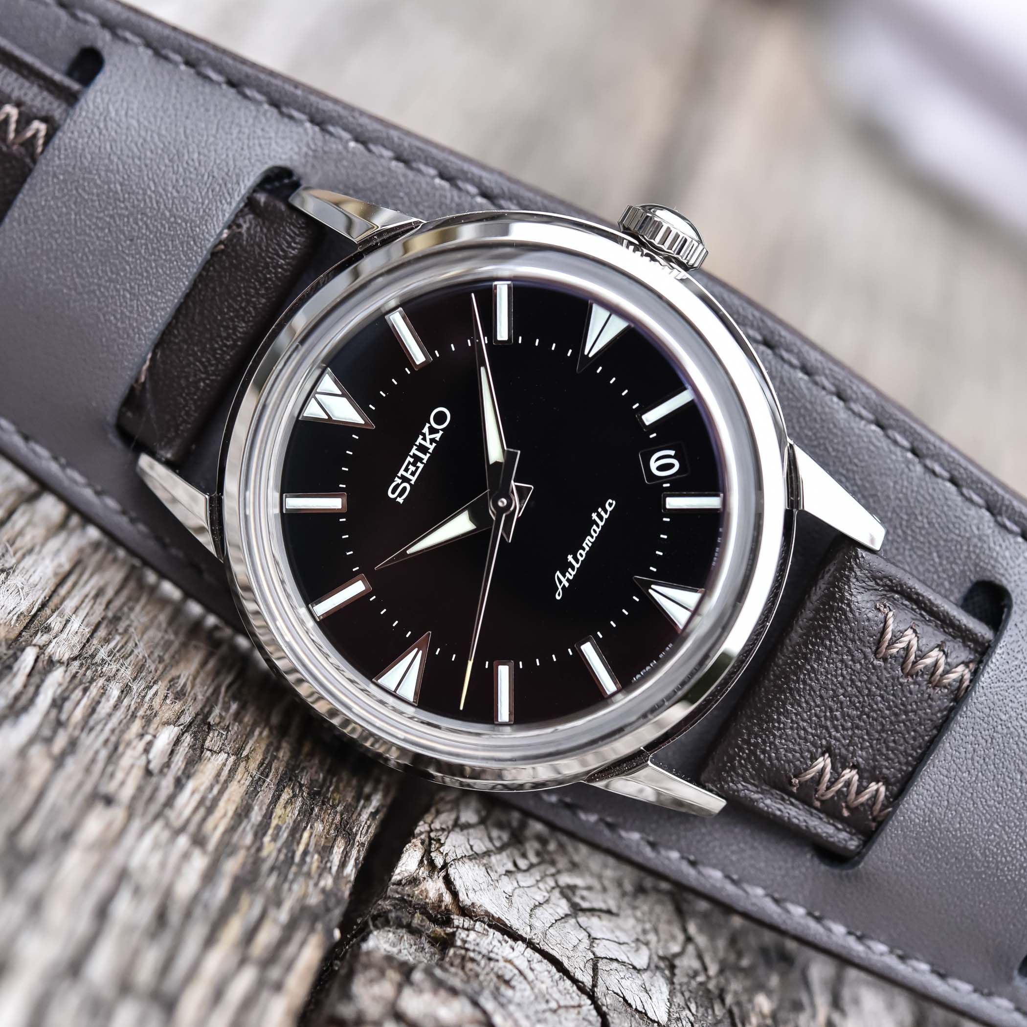Quick Facts – 36.6mm diameter x 11.1mm height – stainless steel case – box-shaped sapphire crystal – 100m water-resistance – glossy black dial with applied segmented markers – Dauphine style hands – 6L35 movement, automatic winding – 45h power reserve – brown calfskin leather strap with grey cuff band underneath the case (removable) – limited to 1,959 pieces – EUR 3,000