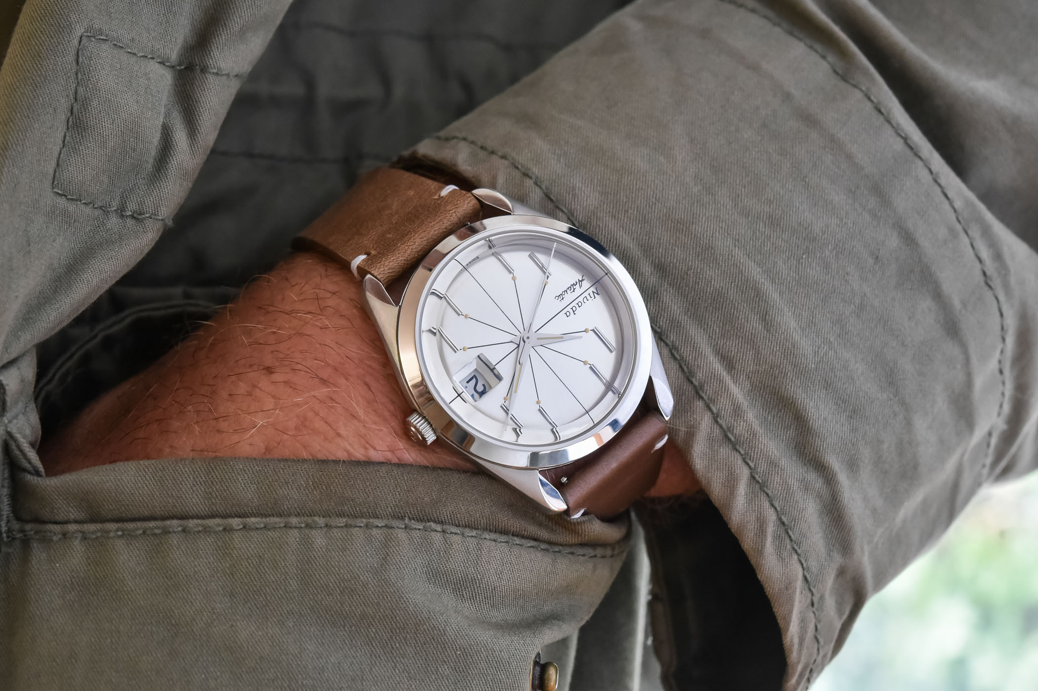 Quick Facts – 38mm diameter x 11.1mm height – stainless steel case – double domed sapphire crystal with date magnifier – 200m water-resistance – sunray-brushed silvery-white “sector spider” dial – vertically applied indices, connected with black printed lines – polished hands – Super-LumiNova – Soprod P024, automatic – 40h power reserve – leather or tropic rubber strap, beads-of-rice bracelet – EUR 650 to EUR 850 depending on strap/bracelet