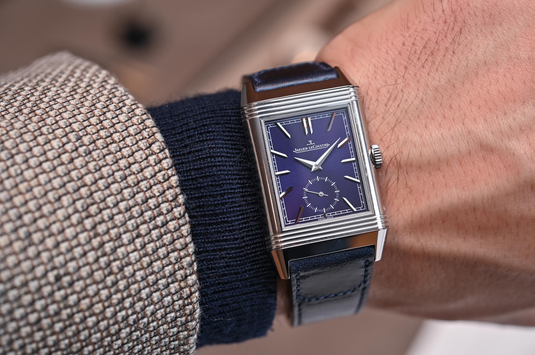Quick Facts – 47mm x 28.3mm x 10.3mm – stainless steel – water-resistant 30m – front dial blue with hours, minutes and small seconds – reverse second time zone dial silver with Clous de Paris guilloché design, hours and minutes counter and day/night indicator – manual-winding JLC calibre 854A/2 – 21,600vph – 42h power reserve – Casa Fagliano leather strap on double-folding buckle – EUR 13,400 (incl. VAT)