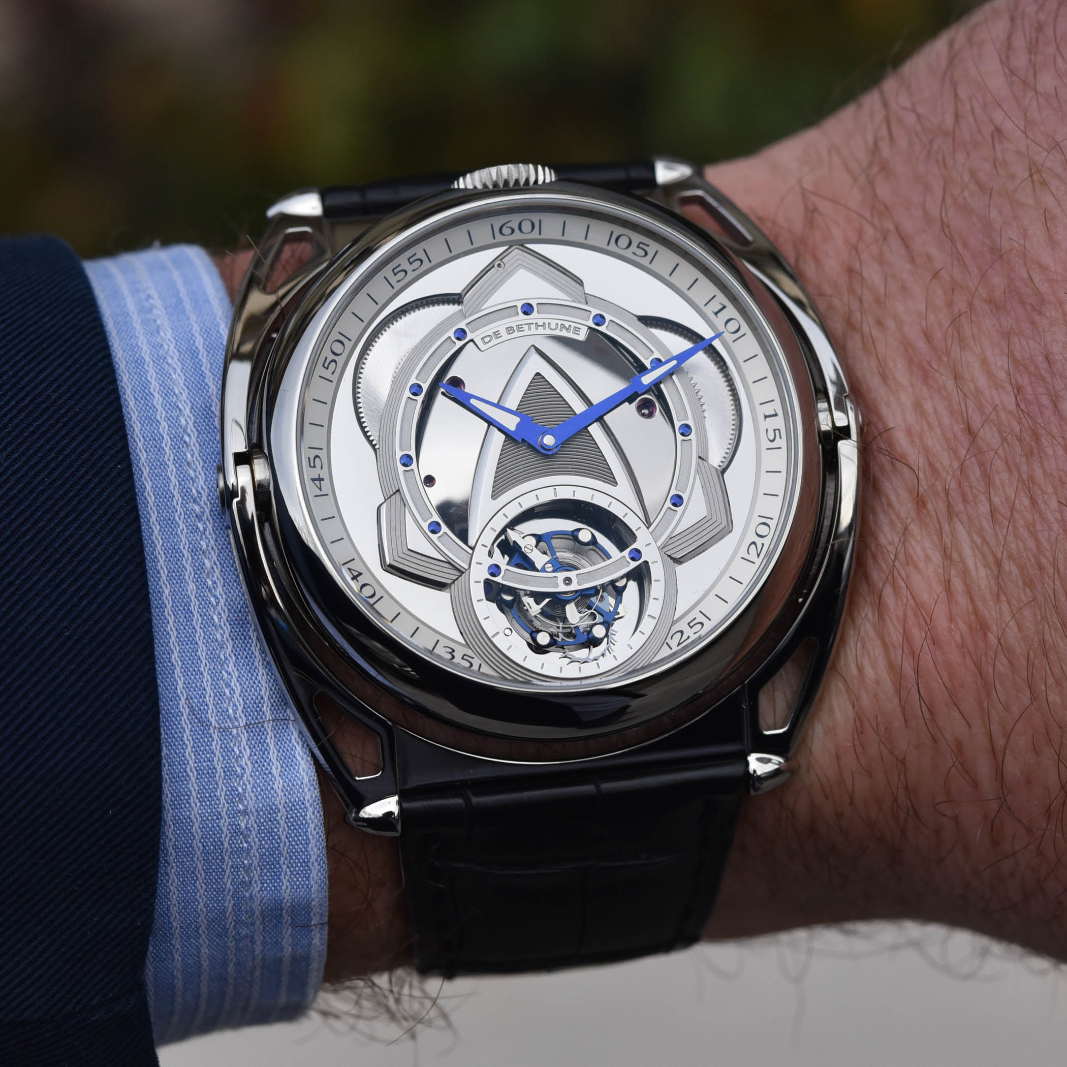 The Kind of Two Tourbillon by De Bethune is a masterpiece by the eccentric independent watchmaker, one that features a reversible container with two incredible sides to it. On one hand, you have a very classical De Bethune-style dial with multiple levels, blued hands and guilloché finishing. The other side reveals a far more contemporary style with partially exposed mechanics and De Bethune’s in-house tourbillon escapement. The case (or rather container) is held in place by De Bethune’s trademark spring-loaded swivelling lugs. There’s now also a Jumping GMT version of it, which we sadly have not yet seen live. It comes with a black alligator leather strap and costs CHF 215,000, before taxes.
