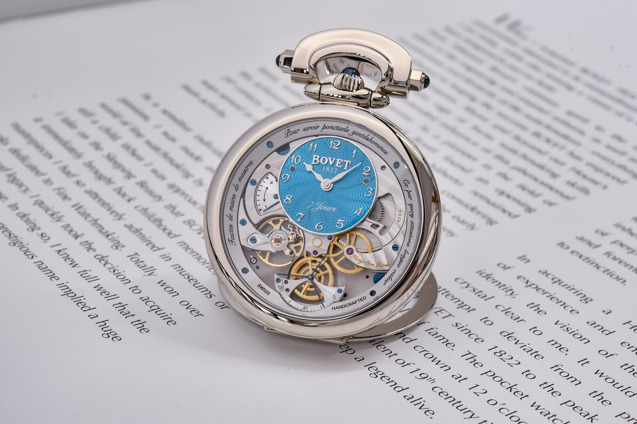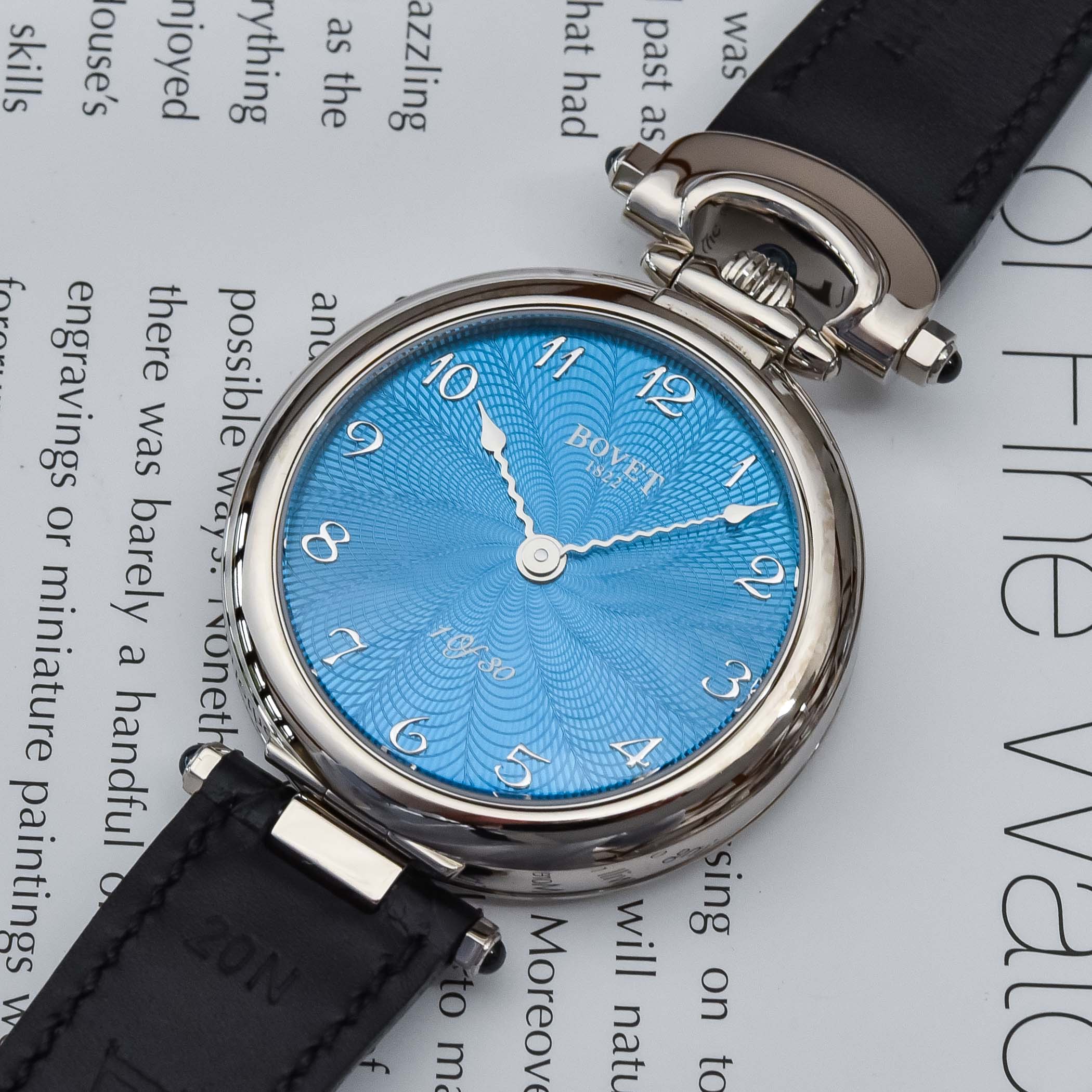 Quick Facts – 43mm x 12.35mm – white gold or red gold case – sapphire crystal front and back – patented Amadeo convertible case construction – 30m water-resistant – turquoise guilloché dials – hours and minutes on side A with hours, minutes, small seconds, power reserve indicator on side B – calibre 13BM09A1, in-house with manual winding – 21,600vph – 41 jewels – 168h power reserve (7 days) – black alligator leather strap or pocket watch chain – limited to 60 pieces (30 in white gold, 30 in red gold) – USD 60,000