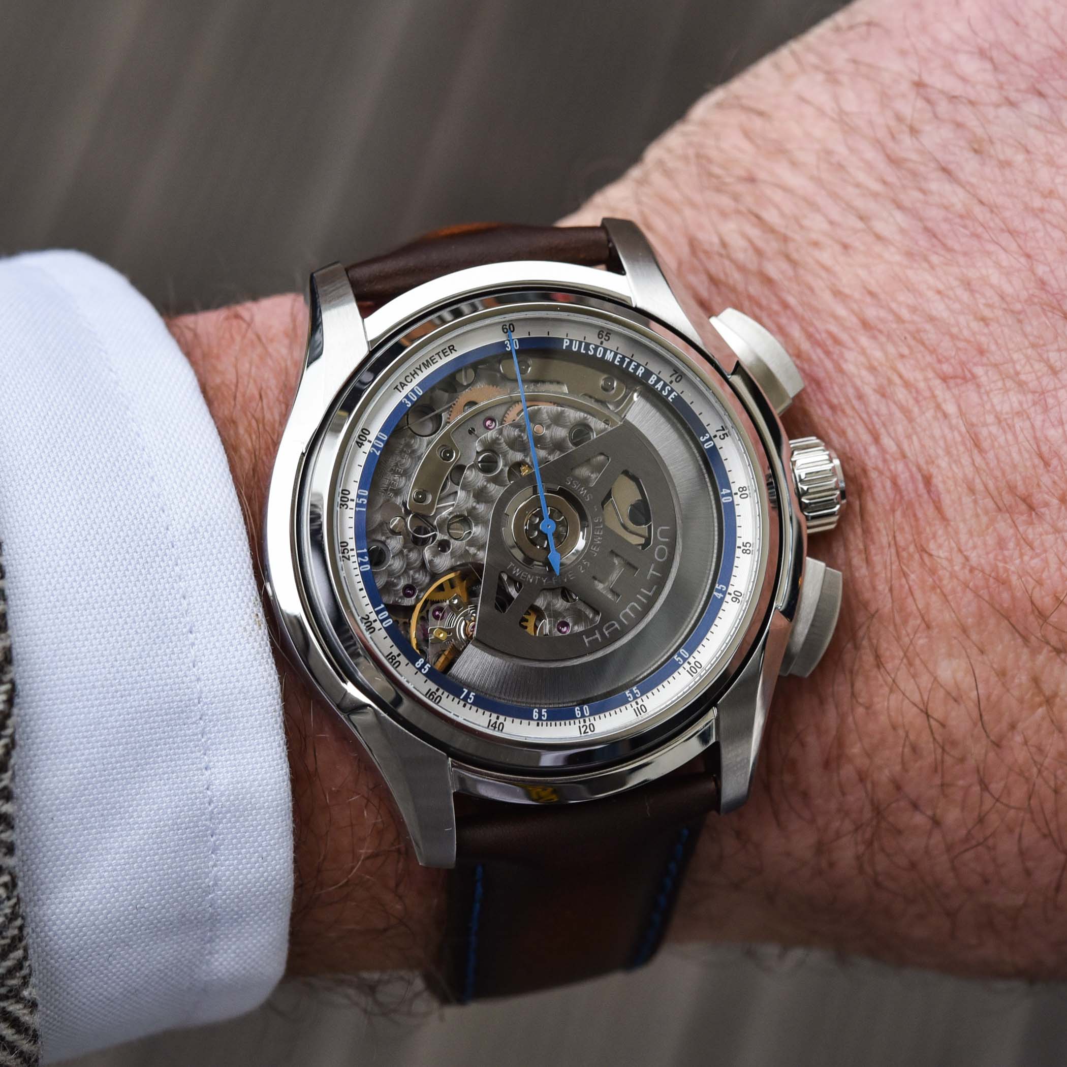 Quick Facts – 44mm x 17.25mm – stainless steel case with rotatable central container – sapphire crystal on both sides – 50m water-resistant – double dials with classical chronograph side and movement side with chronograph seconds – Hamilton calibre H-41, automatic chronograph – 28,800vph – 60h power reserve – central hours and minutes, small seconds, chronograph with double central seconds, 30-min and 12-h counters – brown leather strap – limited to 999 pieces – EUR 2,995