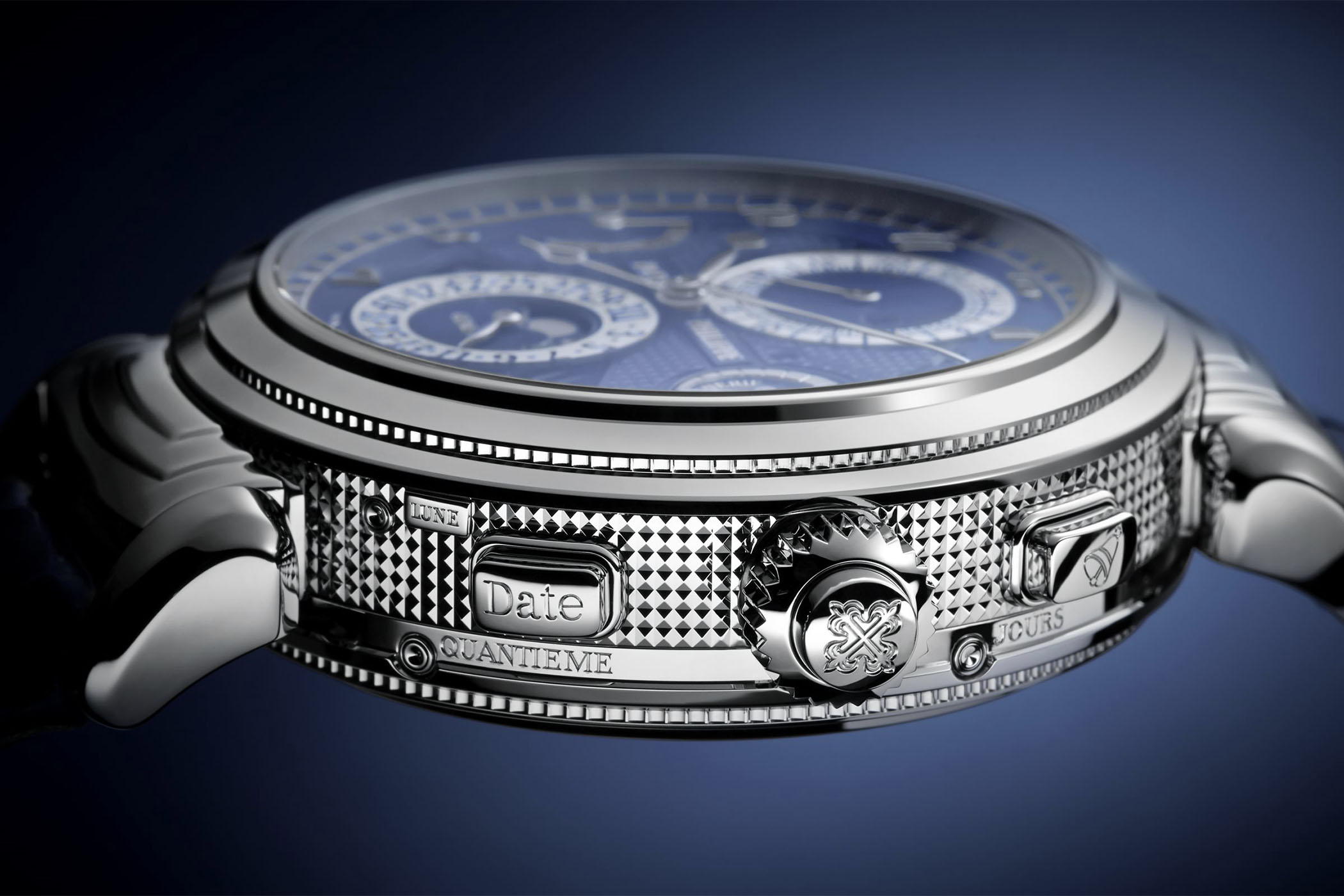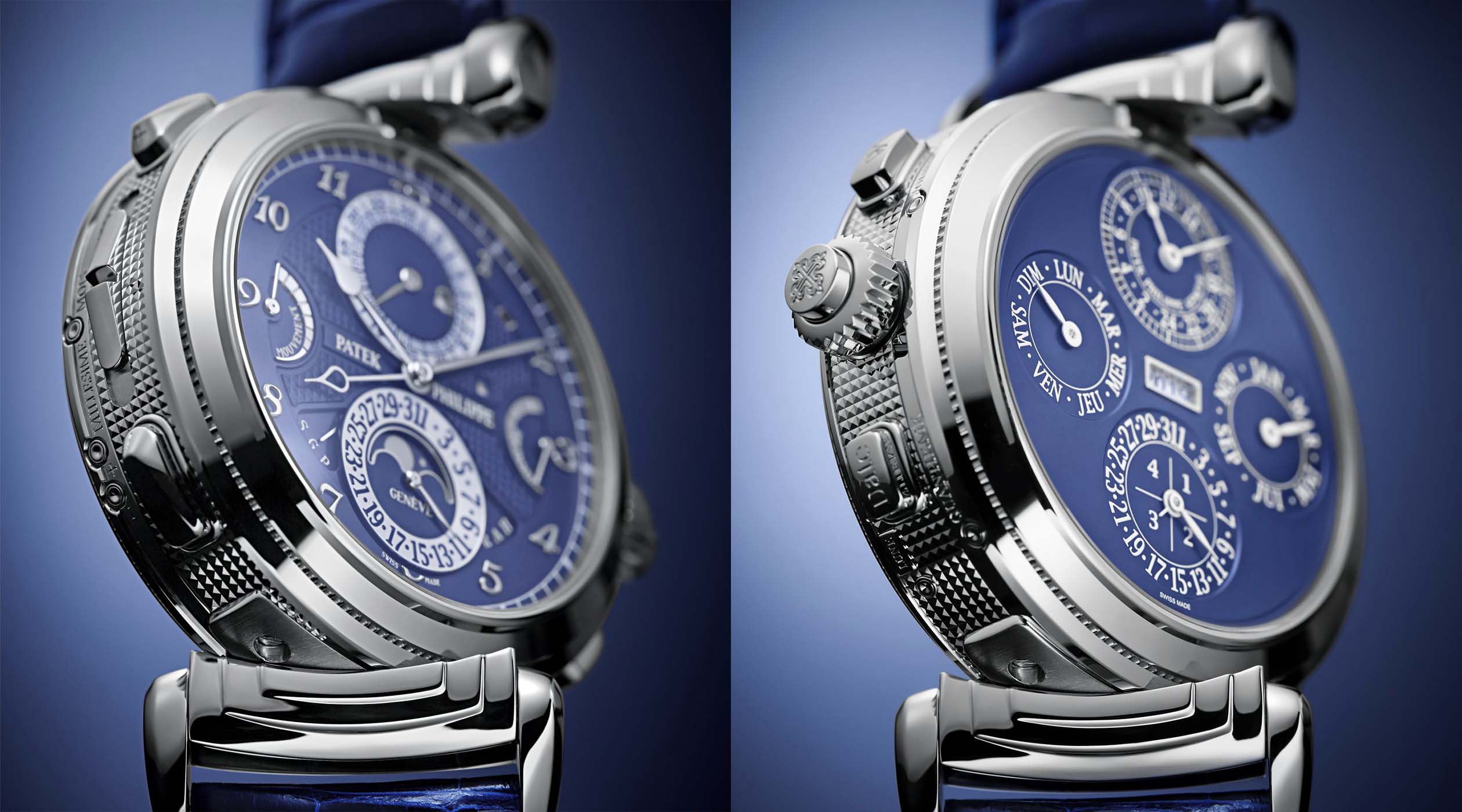 Quick Facts – 47.7mm x 16.07mm – white gold reversible case with hobnail decoration, pushers and correctors – sapphire crystal front and back – blue opaline dials with guilloché decoration, Breguet numerals and 15 hands – calibre 300 GS AL 36-750 QIS FUS IRM, in-house – hand-wound – Patek Philippe Seal – 1,366 parts – 108 jewels – 25,200vph – 72h power reserve – blue alligator leather strap with fold-over clasp – ref. 6300G-010 – Price on Request