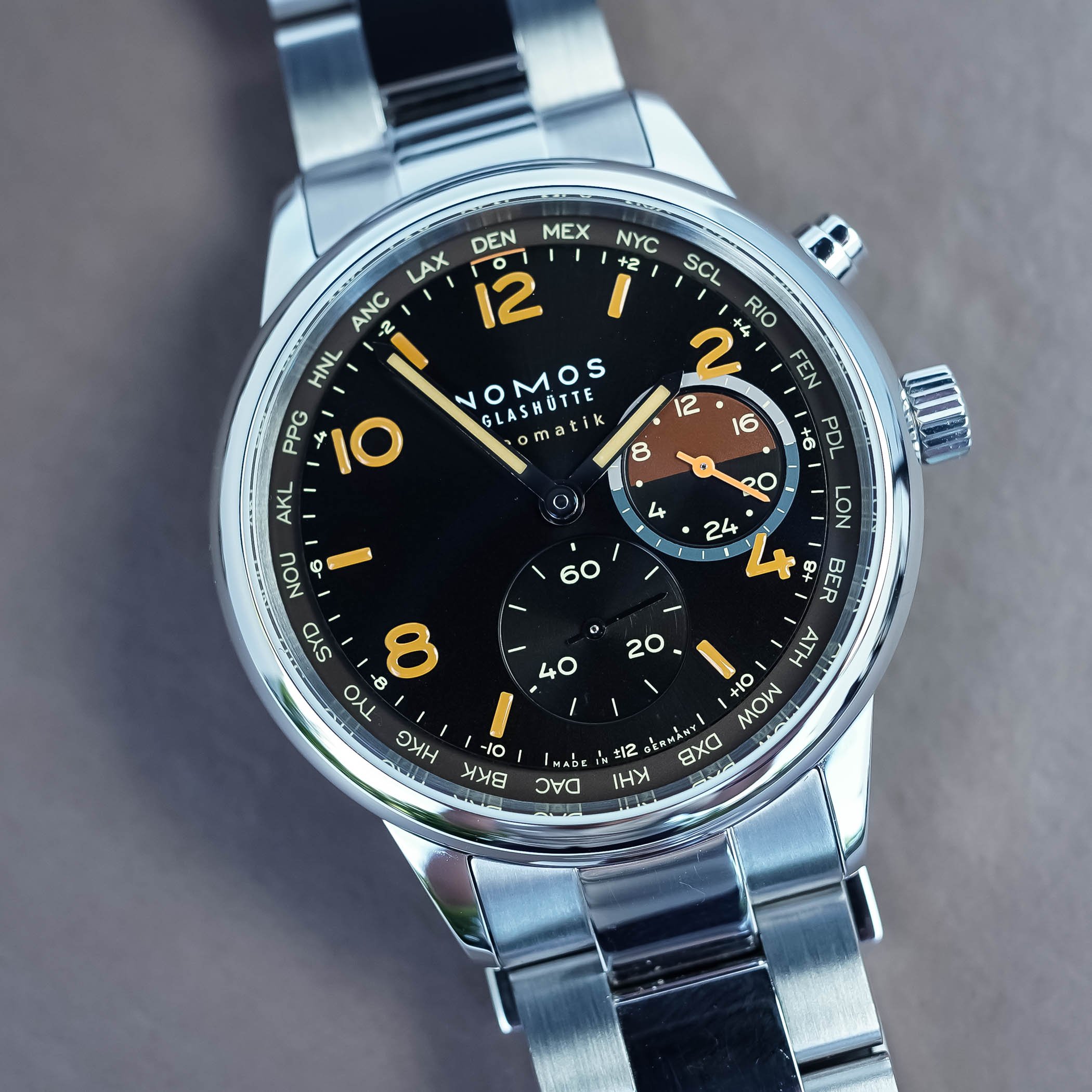 Quick Facts – 40mm x 9.9mm – 48mm lug-to-lug – stainless steel case, polished – screw-down crown, worldtimer pusher – sapphire crystal front & back – 100m water-resistant – sunray-brushed dial, black – grid, orange or yellow details & numerals – calibre DUW 3202, in-house automatic – 21,600vph – 42h power reserve – worldtimer function – stainless steel bracelet, brushed & polished – limited to 175 pieces each – EUR 3,940