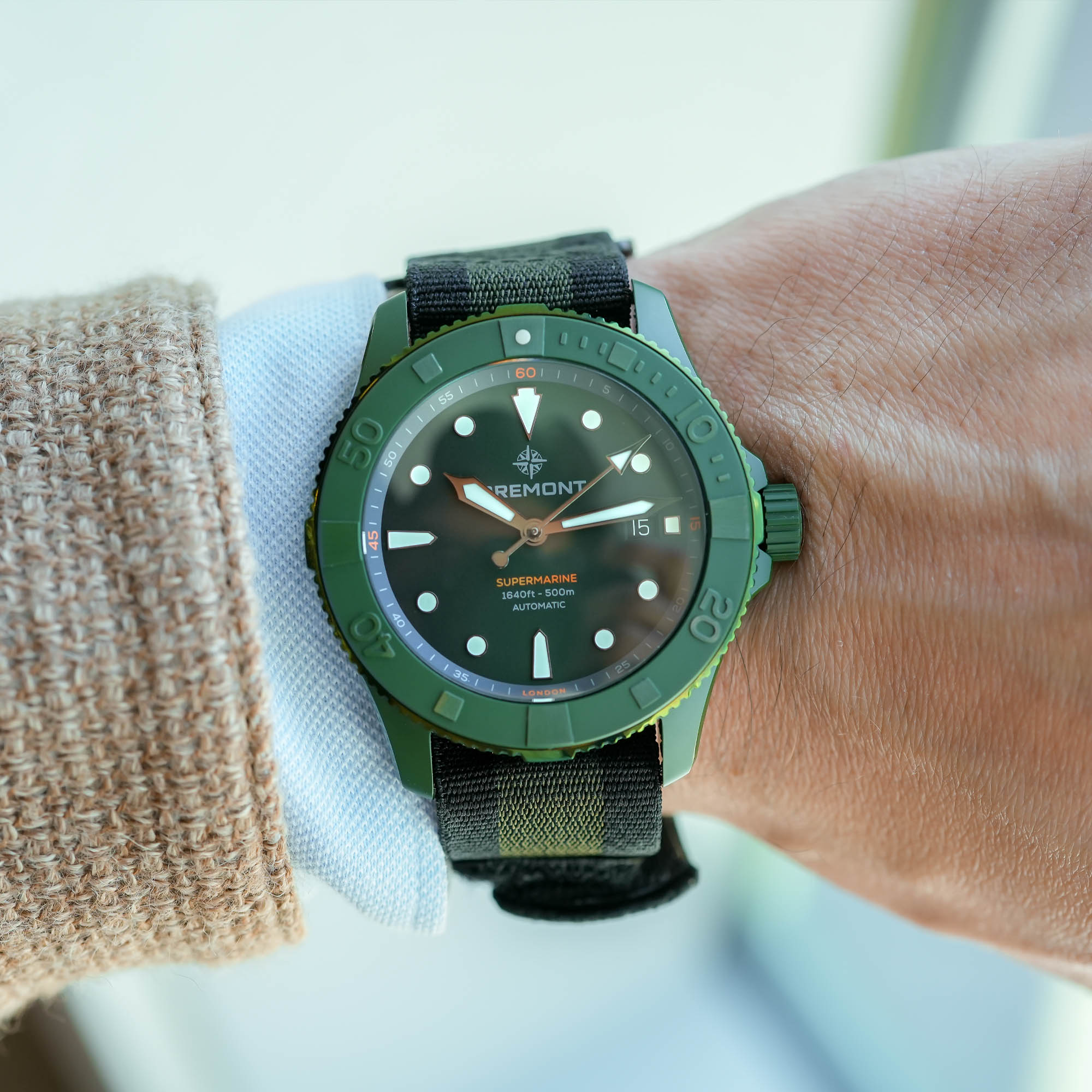 If you want green inside and out, Bremont’s recently introduced Supermarine 500M Ceramic Jungle Green is a solid option for you. As its name suggests, it’s water-resistant to 500 meters and has a completely green ceramic case. This is matched to a Jungle Green gradient dial with applied indices and hands and a green NATO-style textile trap with a Velcro-style fastening system (it also comes with a black rubber strap). The bezel and caseback are also green, but PVD-coated titanium instead. Inside, we find the calibre BE-92AV, which is a Sellita SW300-1A at heart. Limited to 250 pieces, the Supermarine 500M Ceramic Jungle Green retails for EUR 7,750.