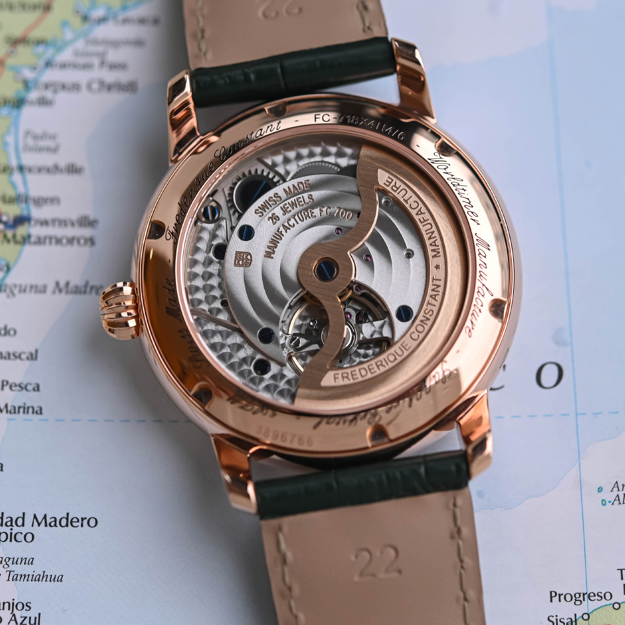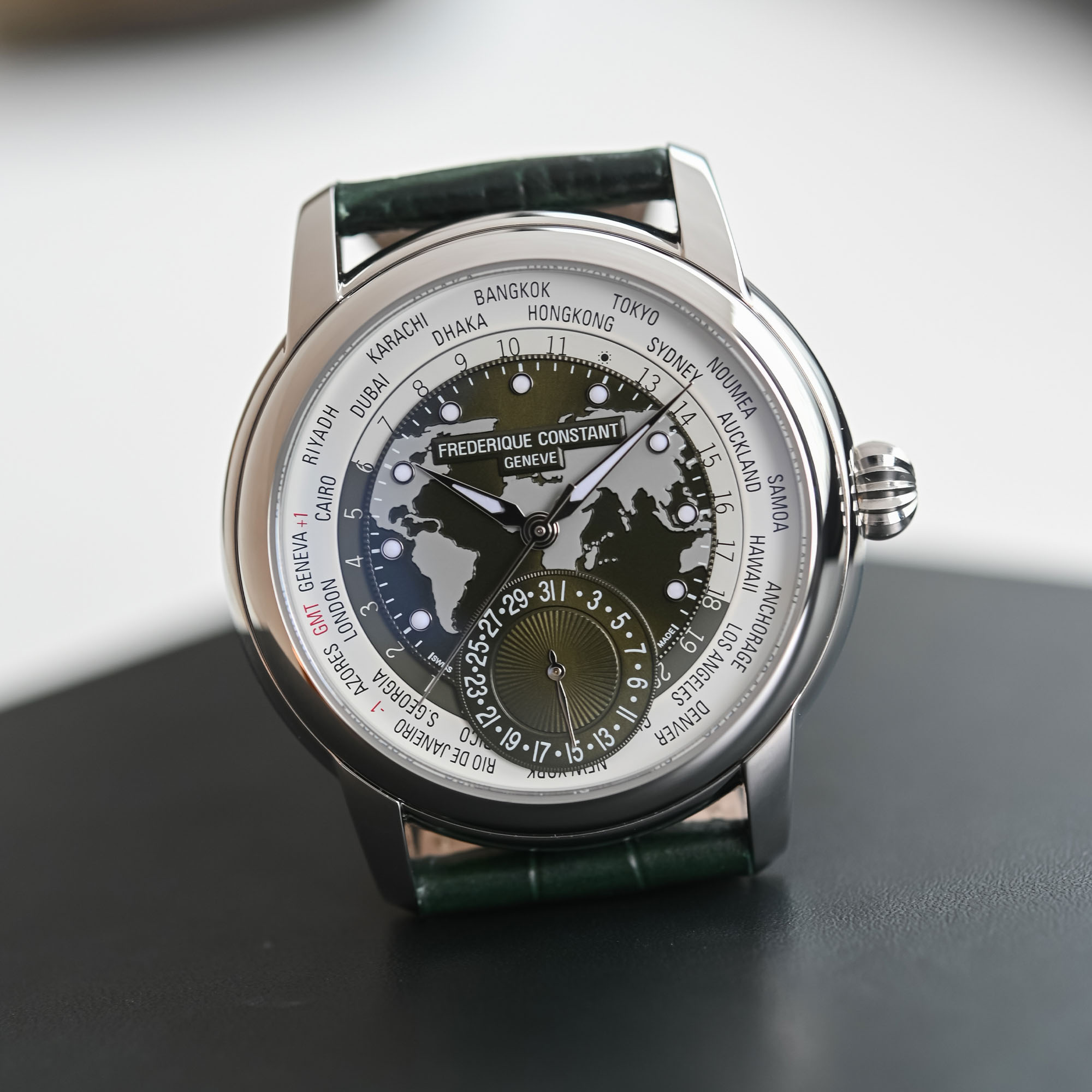 Quick Facts – 42mm x 12.15mm – 18k rose gold or steel case, polished – sapphire crystal front & back – onion-style crown – 30m (gold) or 50m (steel) water-resistant – khaki green & silver dial – world map, two-tone 24h ring, white city disc, date sub-dial – indexes & hands with Super-LumiNova – calibre FC-718, in-house – automatic winding – 28,800vph – 38h power reserve – 36 pieces in gold or 718 pieces in steel – dark green alligator leather strap with folding buckle – EUR 4,395 (steel) or EUR 18,995 (gold)