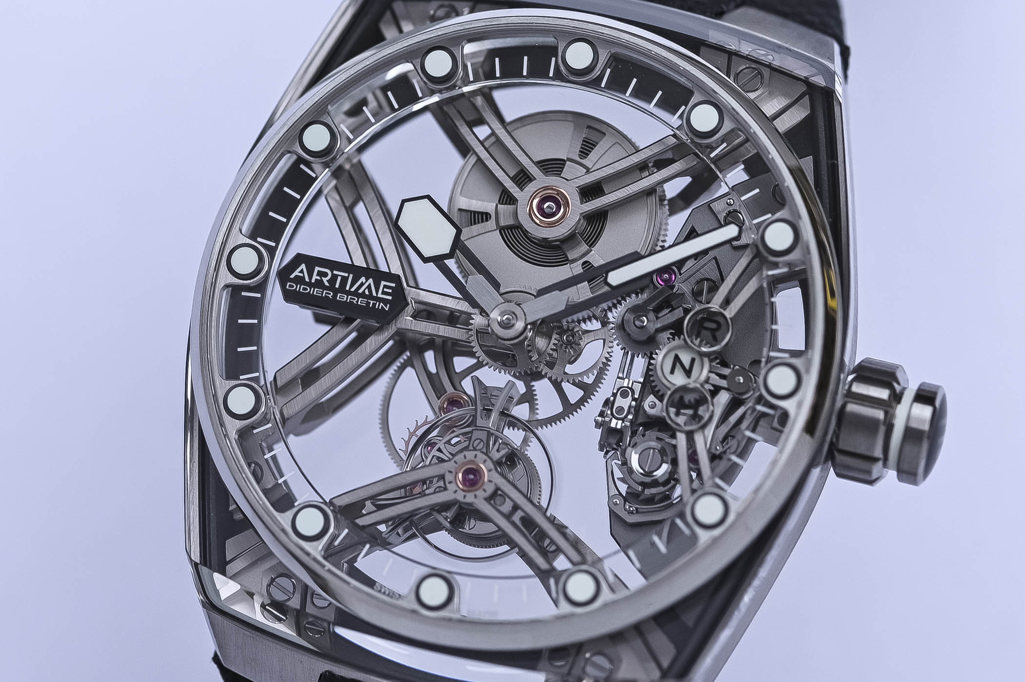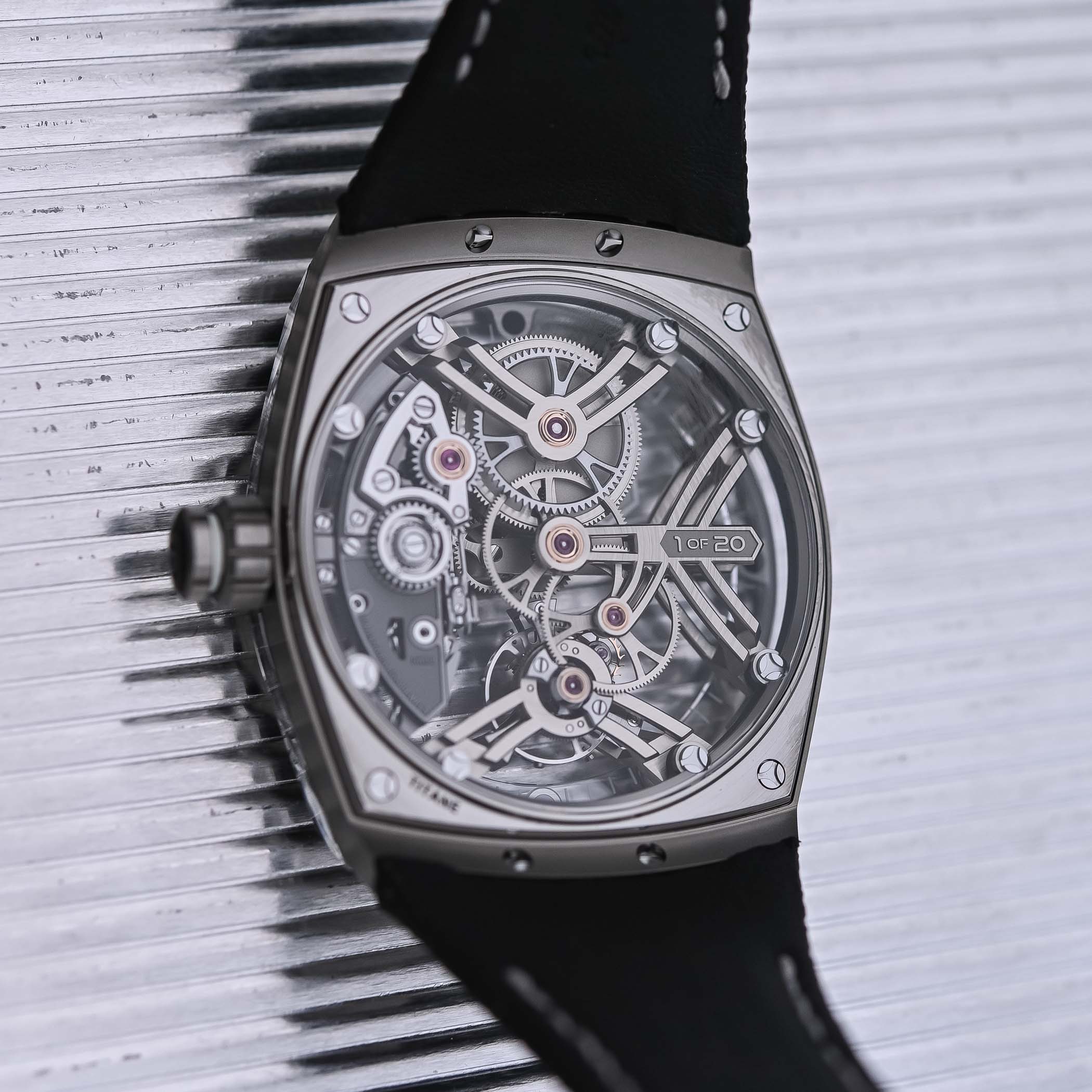 Artime is a very young brand, but it came out swinging for the fences with the ART01 Tourbillon. This highly contemporary watch hides nothing from the eye and is designed with complete transparency in mind from the ground up. The case is constructed of titanium and sapphire crystal elements for an extremely airy look. Central hour and minutes hands indicate the time, with the small seconds indicator on the tourbillon cage. Its crown has a function pusher for the movement, switching from neutral (N), time-setting (H) or winding (R). Worn on a black calfskin leather strap, the 20-piece limited edition costs CHF 195,000.