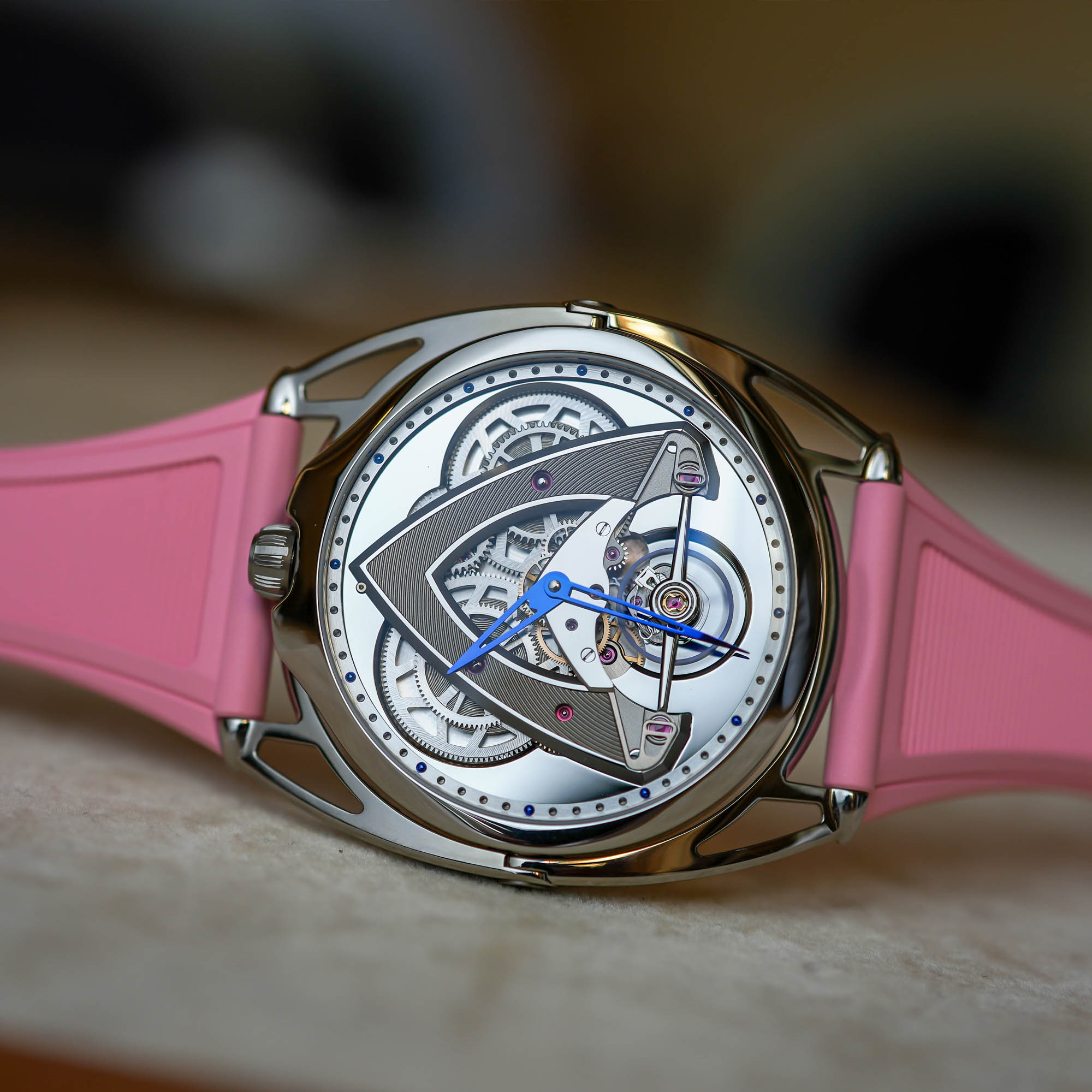 Ignoring (or embracing, if you will) the very vibrant pink strap it was on when we shot it, the De Bethune DB28XS Steel Wheels is an absolute masterpiece. And while it’s not a through-and-through openworked watch, De Bethune is known for often pulling back the curtains on their incredible movements. With a compact and very thin case and an exposed escapement and running gear, the DB28XS Steel Wheels is a feast for the eyes. The delta-shaped bridge that covers most of it is a signature styling element, as are the blued components front and back. Retailing for CHF 82,000, there’s now a whole range of strap options to choose from.