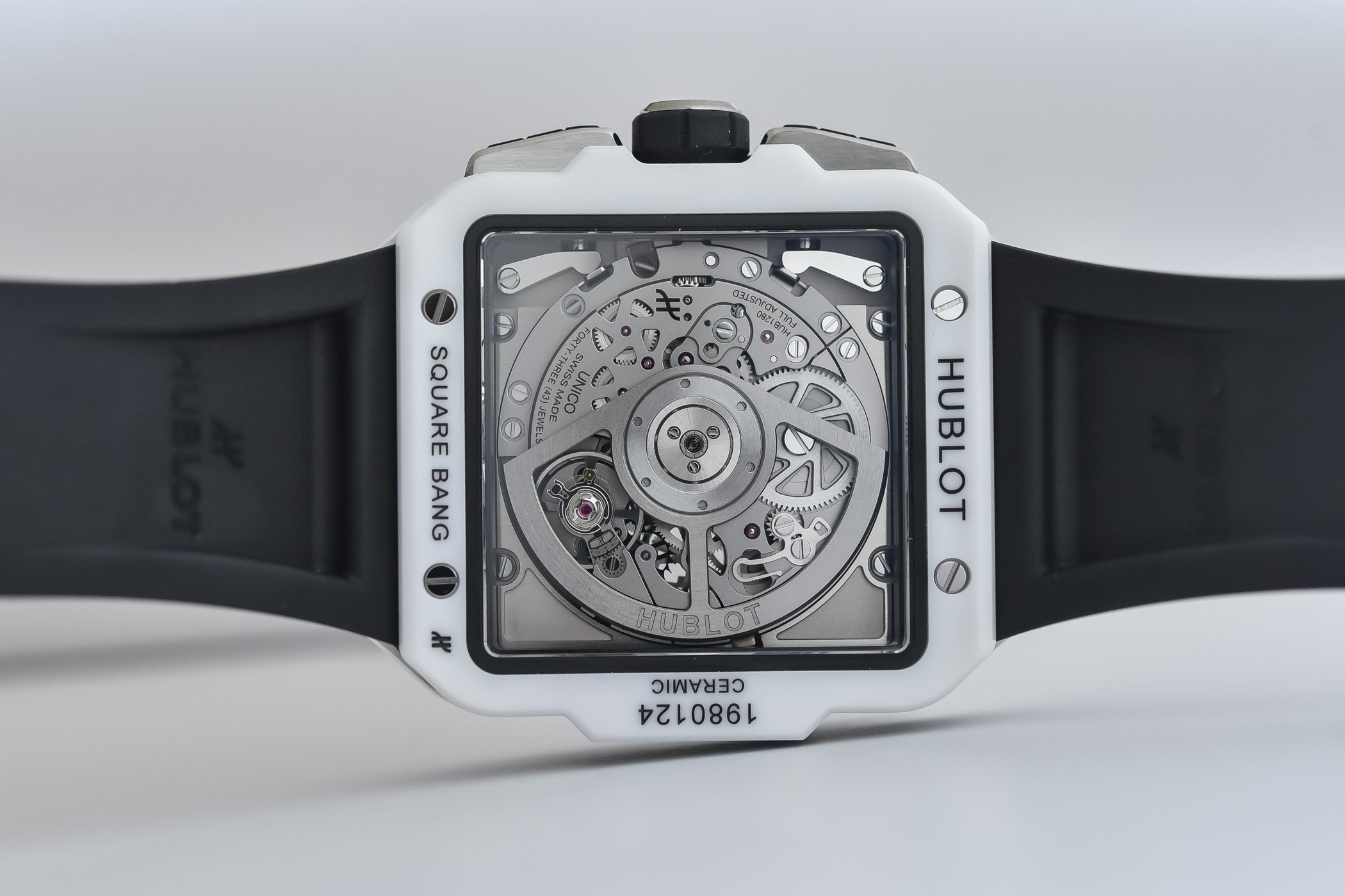 Quick Facts – 41mm x 12mm – modular white ceramic case with black elements – rubber-clad pushers & crown – sapphire crystal front & back – 50m water-resistant – open-worked dial – applied indices on peripheral flange – hands with Super-LumiNova – calibre HUB1280, in-house – automatic flyback chronograph with column wheel – 28,800vph – 72h power reserve – structured white rubber strap with One Click interchangeability system & folding clasp – EUR 24,900