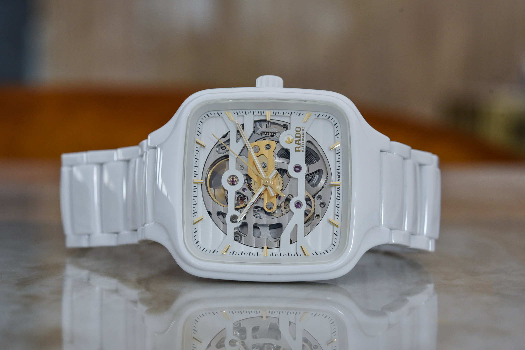 Quick Facts – 38mm x 44.2mm x 9.7mm – white high-tech ceramic monobloc case & crown – sapphire crystal front & back – 50m water-resistance – skeletonised dial – traverse bridges – indices and hour & minute hand with Super-LumiNova – Rado calibre R808 (base ETA), automatic – 21,600vph – 80h power reserve – Nivachron hairspring – integrated white high-tech ceramic bracelet with titanium folding clasp – EUR 3,000