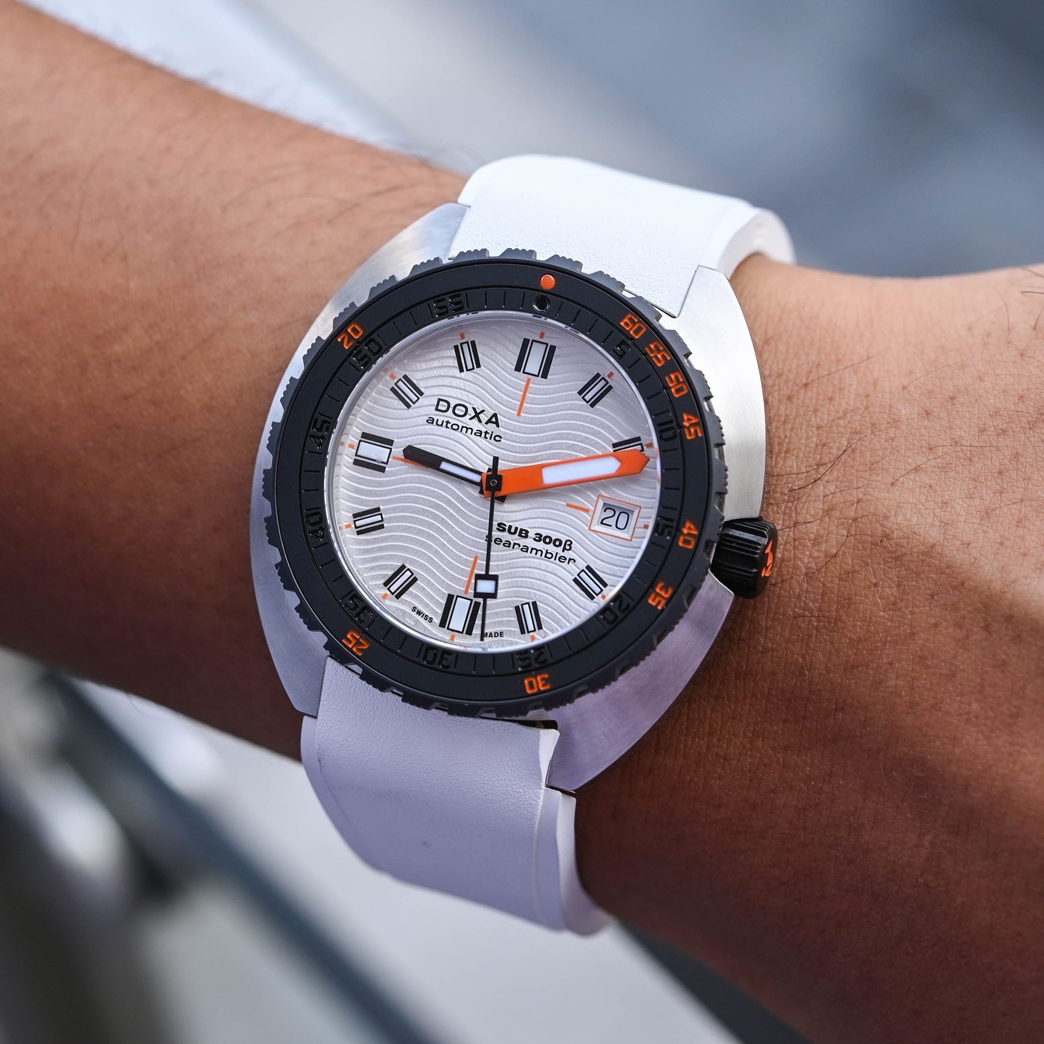 Quick Facts – 42.50mm x 44.50mm x 11.95mm – stainless steel case, brushed & polished – unidirectional bezel in black ceramic with double diving scale – helium escape valve – 300m water-resistance – sunburst silvery-white dial with wave pattern – hands and markers with Super-LumiNova – Sellita SW200 – automatic – 28,800vph – 38h power reserve – white FKM rubber strap with adjustable folding clasp – steel Beads of Rice bracelet – EUR 2,410 (FKM rubber) or EUR 2,450 (BoR bracelet)