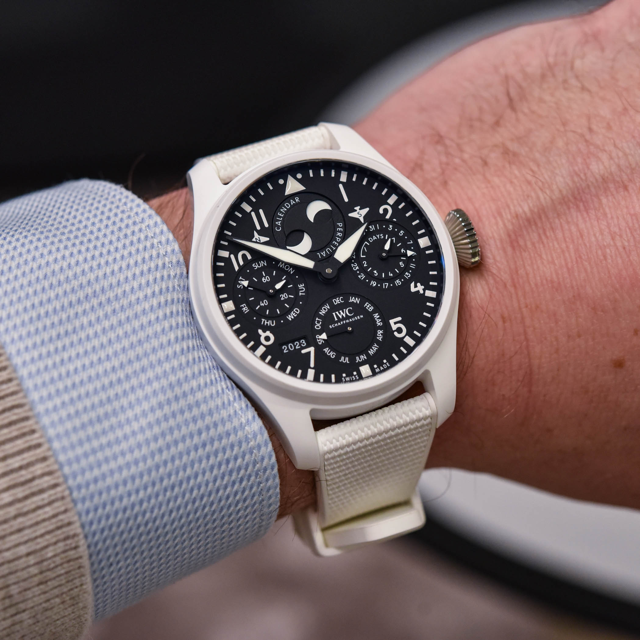 Quick Facts – 46.5m x 15.5mm – white ceramic case – stainless steel screw-in crown – sapphire crystal front & back – 60m water-resistant – matte black dial with luminescent indices – QP display with date, day, month, four-digit year, perpetual northern & southern moon phase – 7-day power reserve – calibre 52615, in-house – automatic winding – white rubber strap with textile inlay & deployant clasp – IW503008 – EUR 43,700