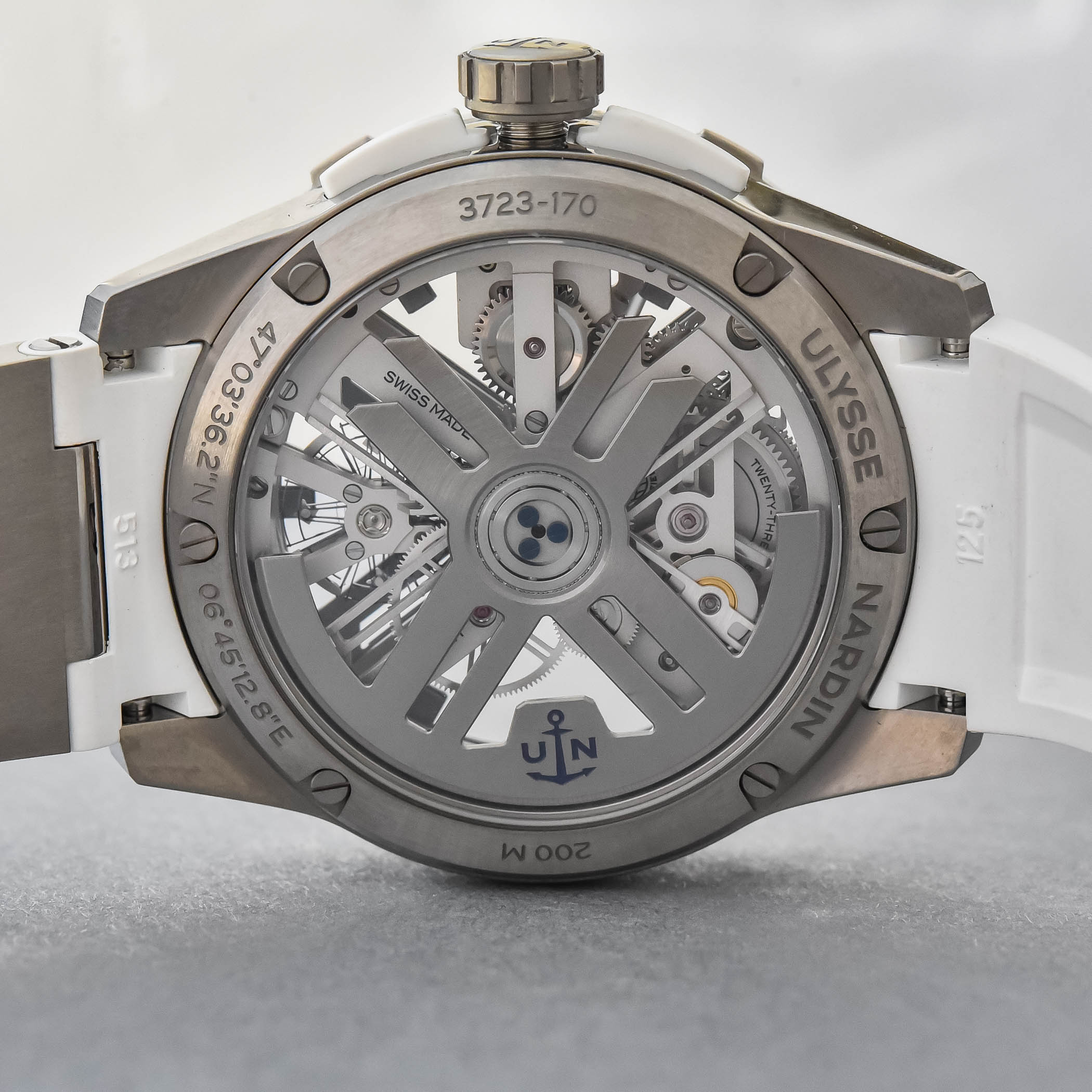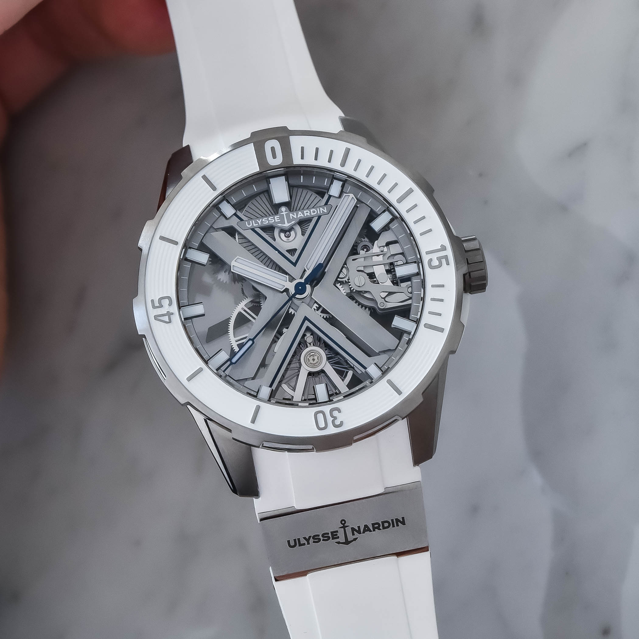 Quick Facts – 44mm diameter – titanium case – rubberised diving bezel – white rubber crown guards – screw-down crown – sapphire crystal front & back – 200m water resistant – X-shaped bridges – semi-floating indices – hands with luminous coating – calibre UN-372, in-house – automatic wincing – skeleton construction – 21,600vph – 96h power reserve – white rubber strap with titanium UN element & deployant buckle – white fabric strap with Scratch closing – EUR 26,800