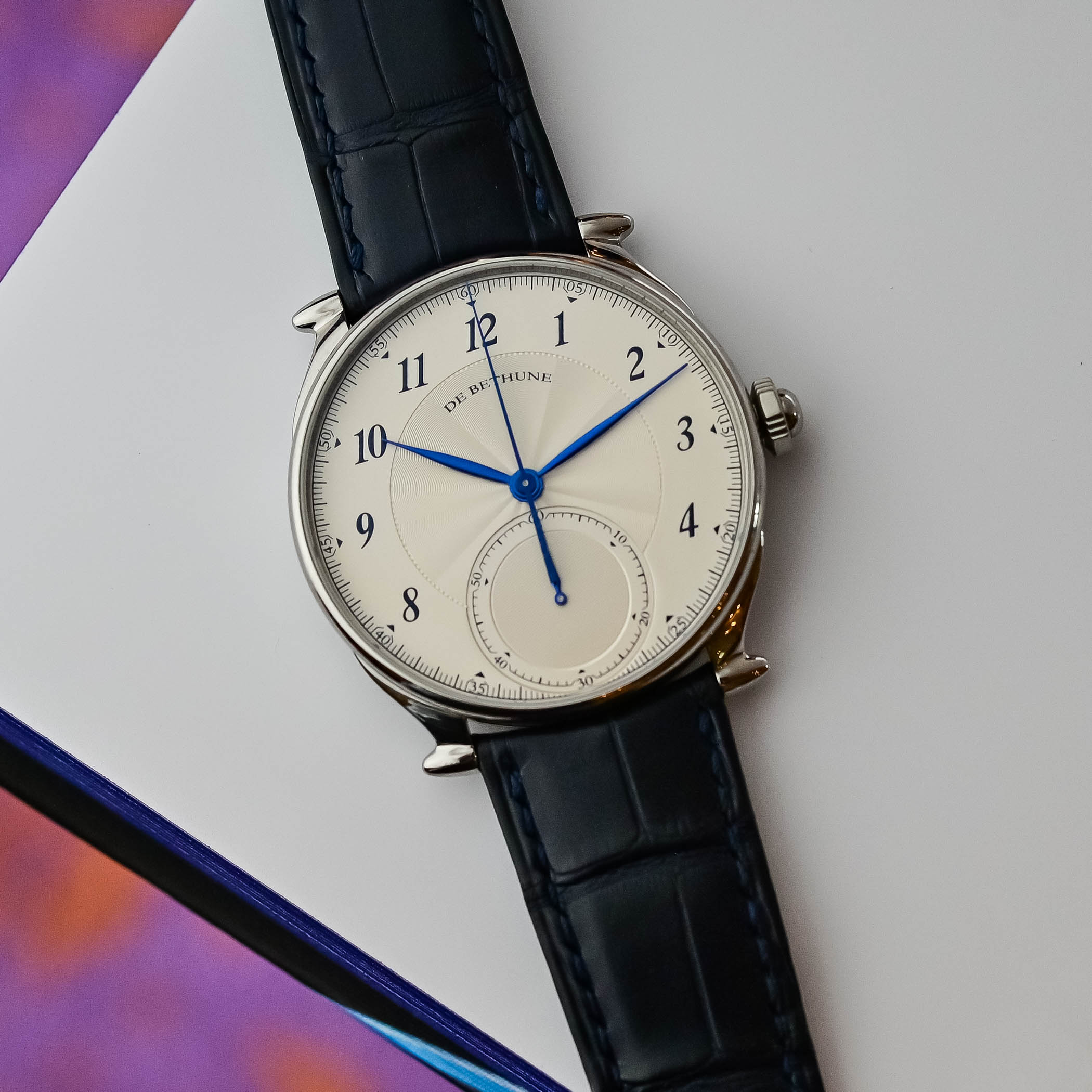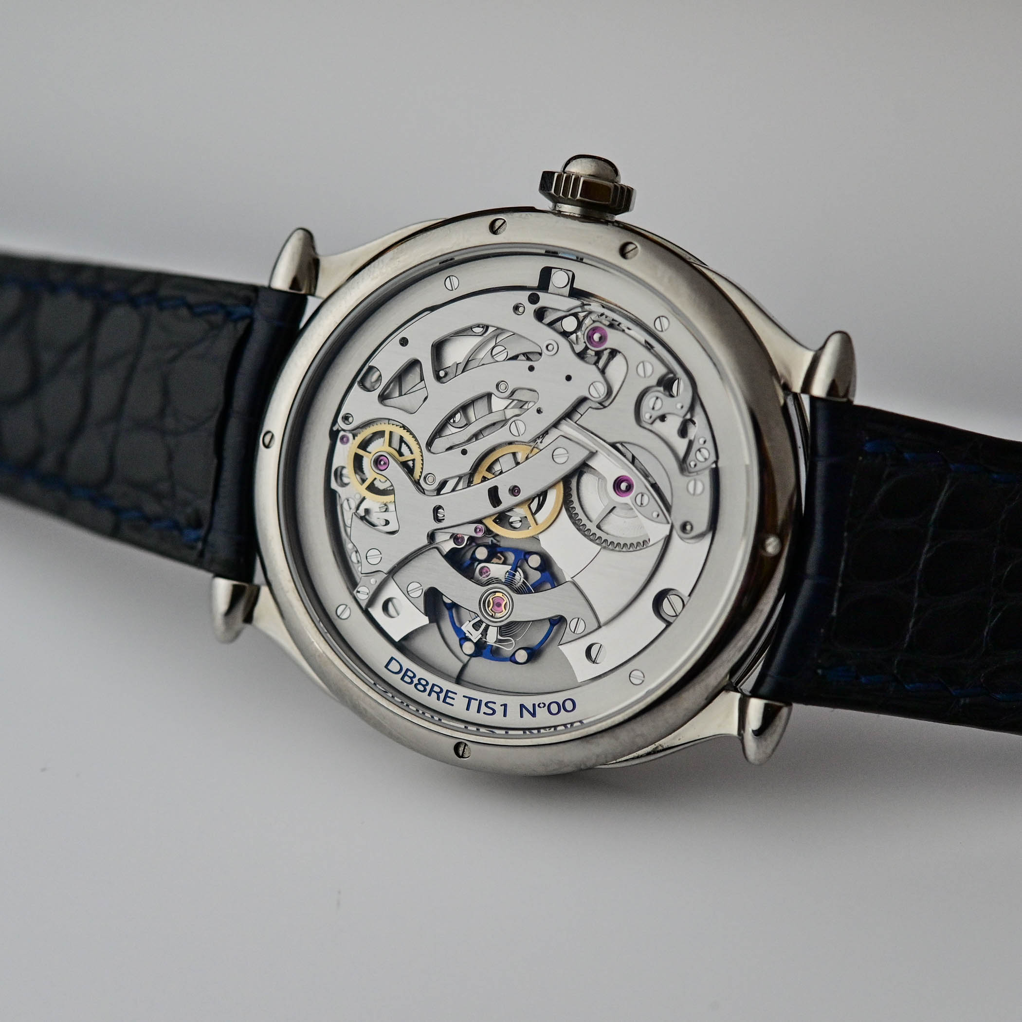 Quick facts – 42.4mm x 9.2mm – polished grade 5 titanium case – ogive-shaped lugs – sapphire crystal front and back – silver-tone guilloché dial – blued hands for the hours, minutes and chronograph – calibre DB3000, in-house – hand-wound – column-wheel monopusher chronograph – titanium balance with De Bethune spiral – 28,800vph – 60h power reserve – blue alligator leather strap with titanium pin buckle – CHF 85,000