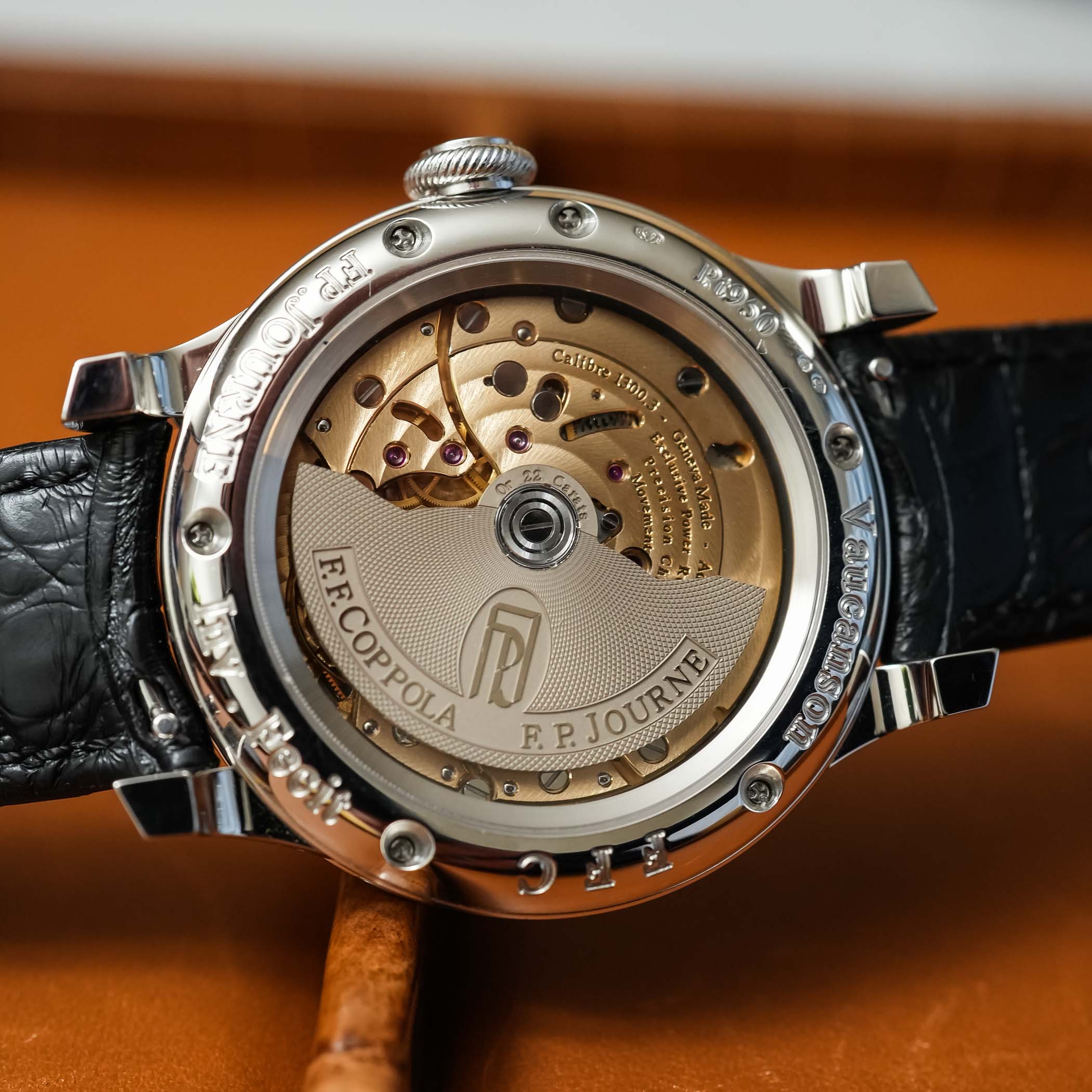 Quick facts – 42mm x 10.70mm – platinum case, polished – sapphire crystal front and back – openworked dial with titanium articulated mechanical hand – retractable fingers for the hours – rotating minute disc with triangular pointer at noon – F.P. Journe calibre 1300.3 in 18k rose gold – automatic winding – 21,600vph – 120h power reserve – instantaneous digital hours with rotating minute disc – Nivatronic laser-soldered balance spring – titanium bridges with Titalyt® coating – double-signed central rotor – in-line lever escapement – black alligator leather strap – limited by production – price upon request