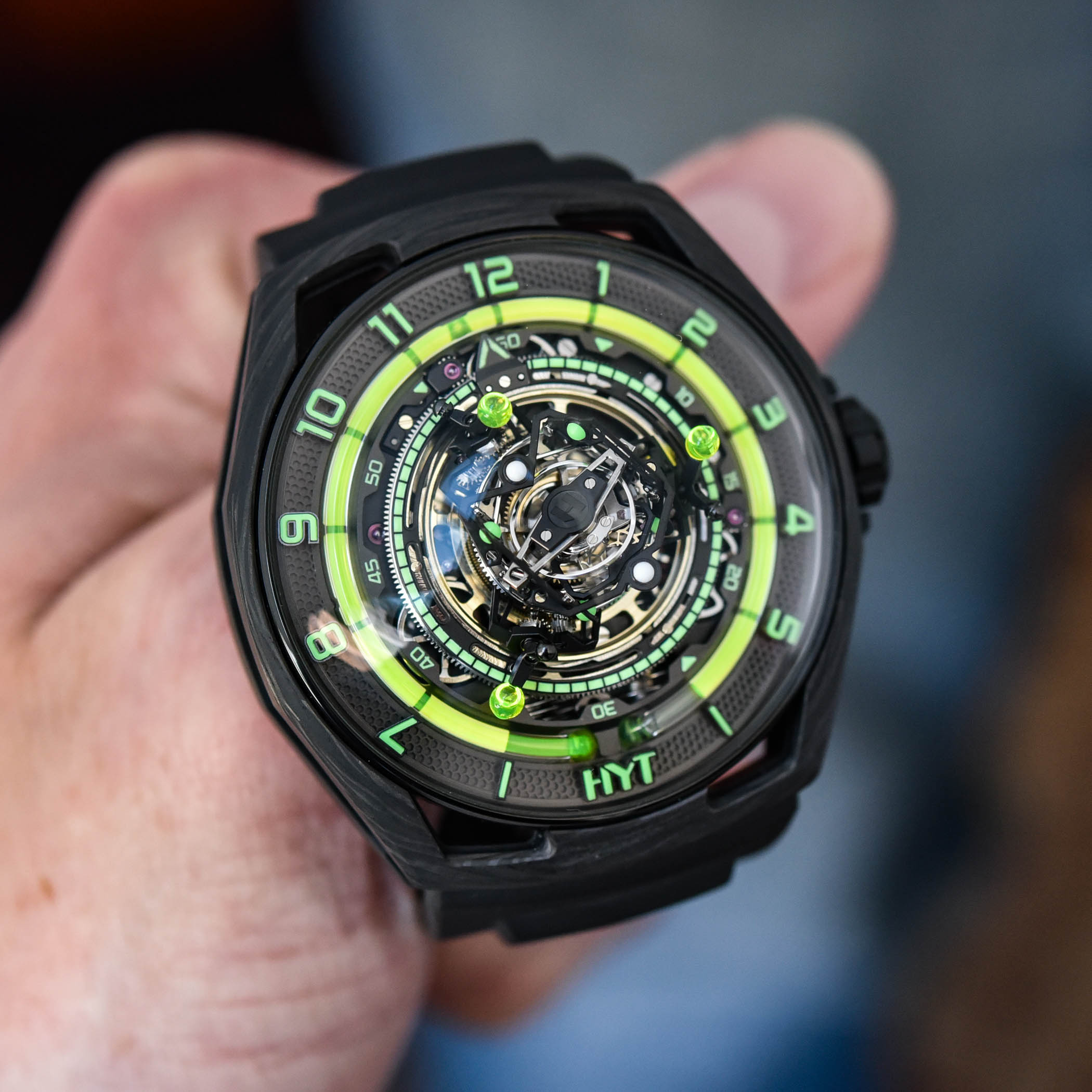 Ever since its revival in 2022, HYT has incrementally added complexity to its unique fluidic display of time. It started with the Hastroid, which relaunched the brand and was followed by the Moon Runner and now the Conical Tourbillon. This show-stopper features the brand’s signature capillary hour display but reveals a complex central tourbillon mechanism with hand-blown glass orbs filled with luminous liquid moving around in chaotic order. Covered by a highly domed sapphire crystal, it’s a very special site to behold from the top but also from all sides. The 48mm x 52.3mm carbon and titanium case is very large but also very light and keeps this limited run of eight pieces somewhat wearable. The price is a staggering CHF 335,000.