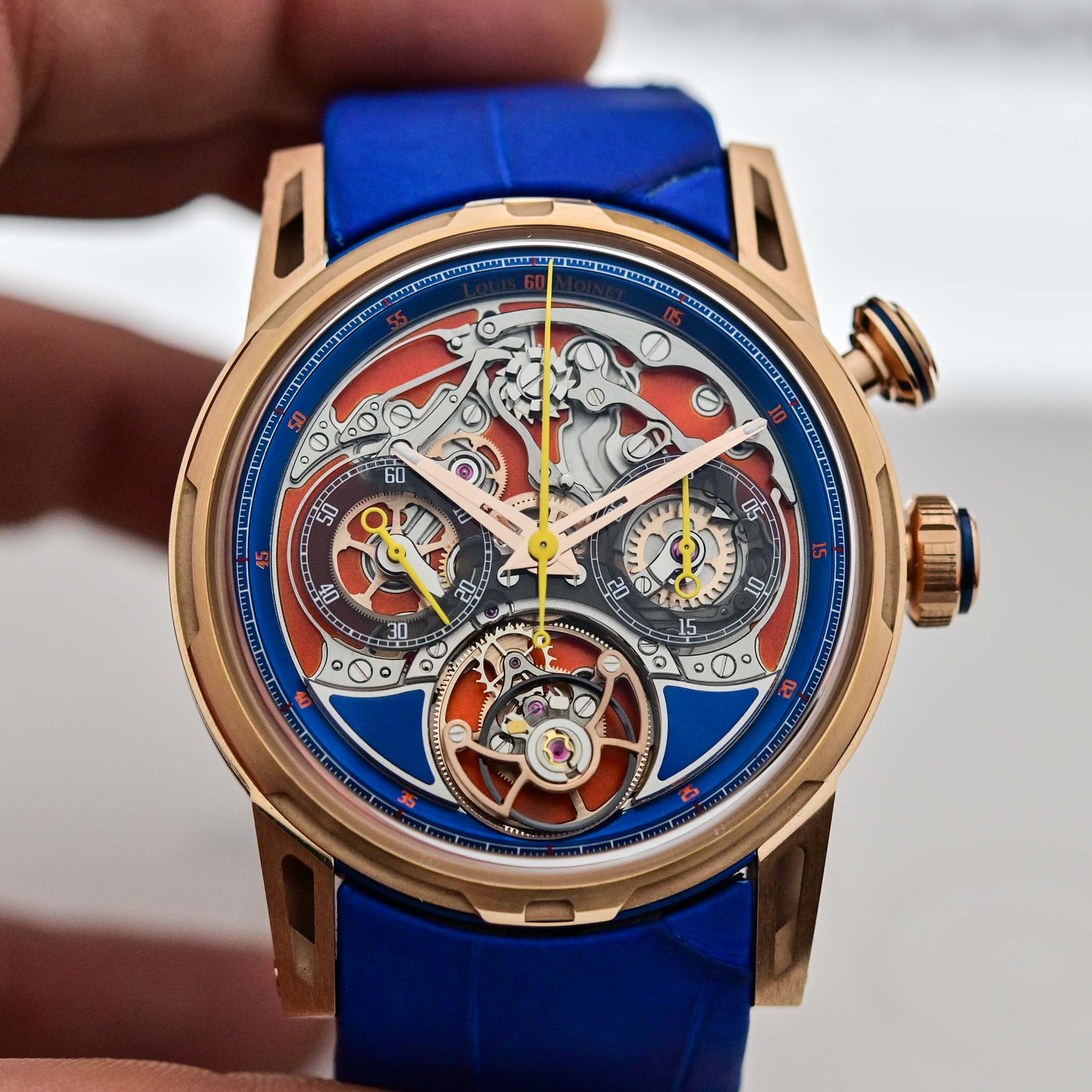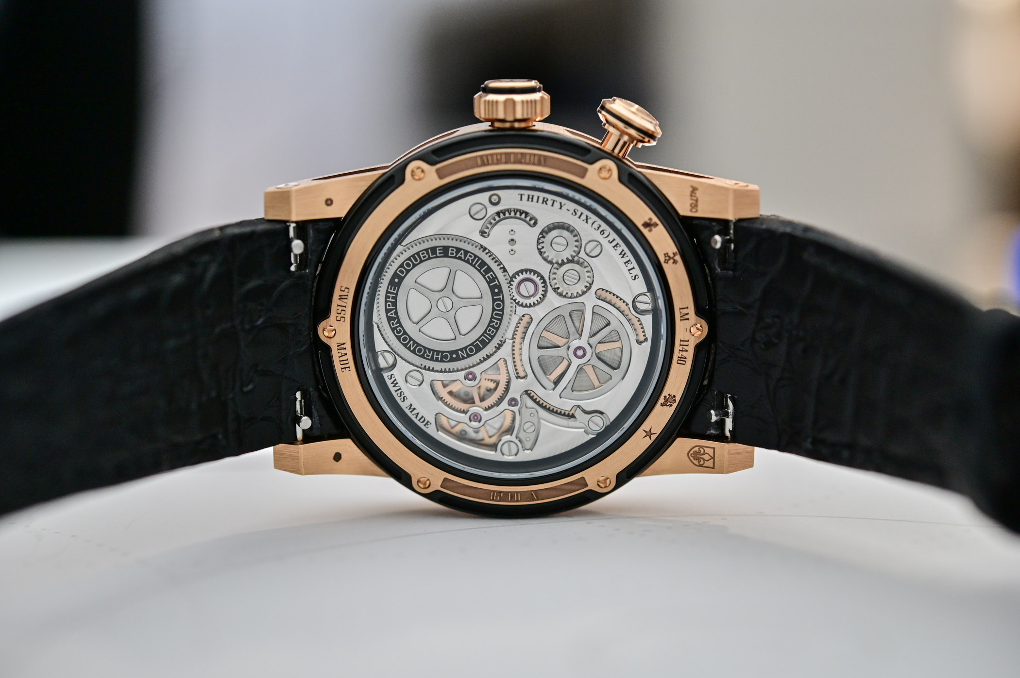 Quick facts – 42.50mm diameter – grade 5 titanium or rose gold case – chronograph pusher at 2′ – sapphire crystal front & back – black, aventurine or orange dial mainplate – exposed chronograph and tourbillon mechanism – gold hour & minute hands – red or yellow chronograph hands – calibre LM114, developed with Concepto – manual-winding – monopusher chronograph with column-wheel and horizontal clutch – 301 parts – 28,800vph – double barrel for 96h power reserve – alligator leather strap – limited to 3 (orange mainplate) or 28 pieces (black or aventurine mainplate) – CHF 130,000 (excl. taxes)
