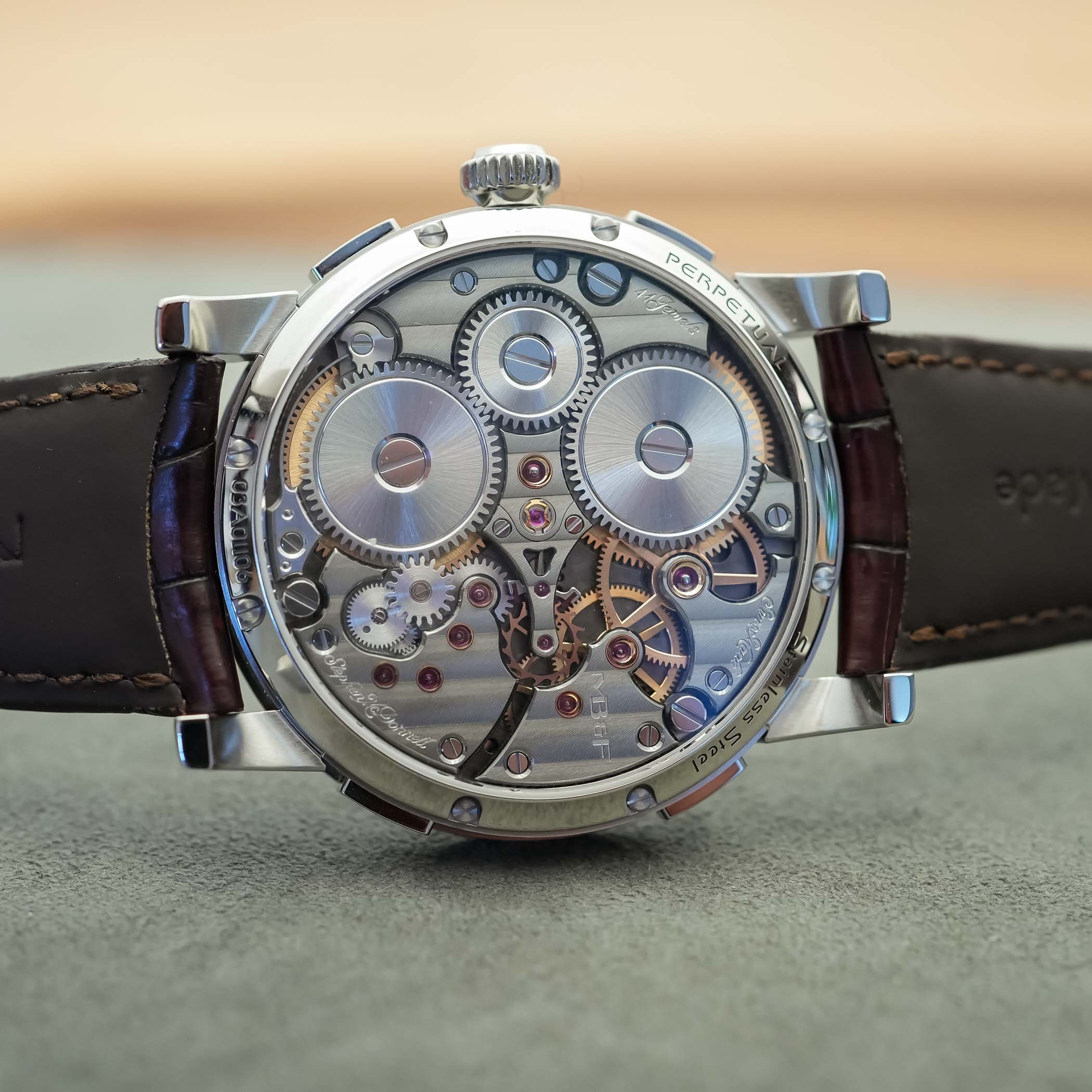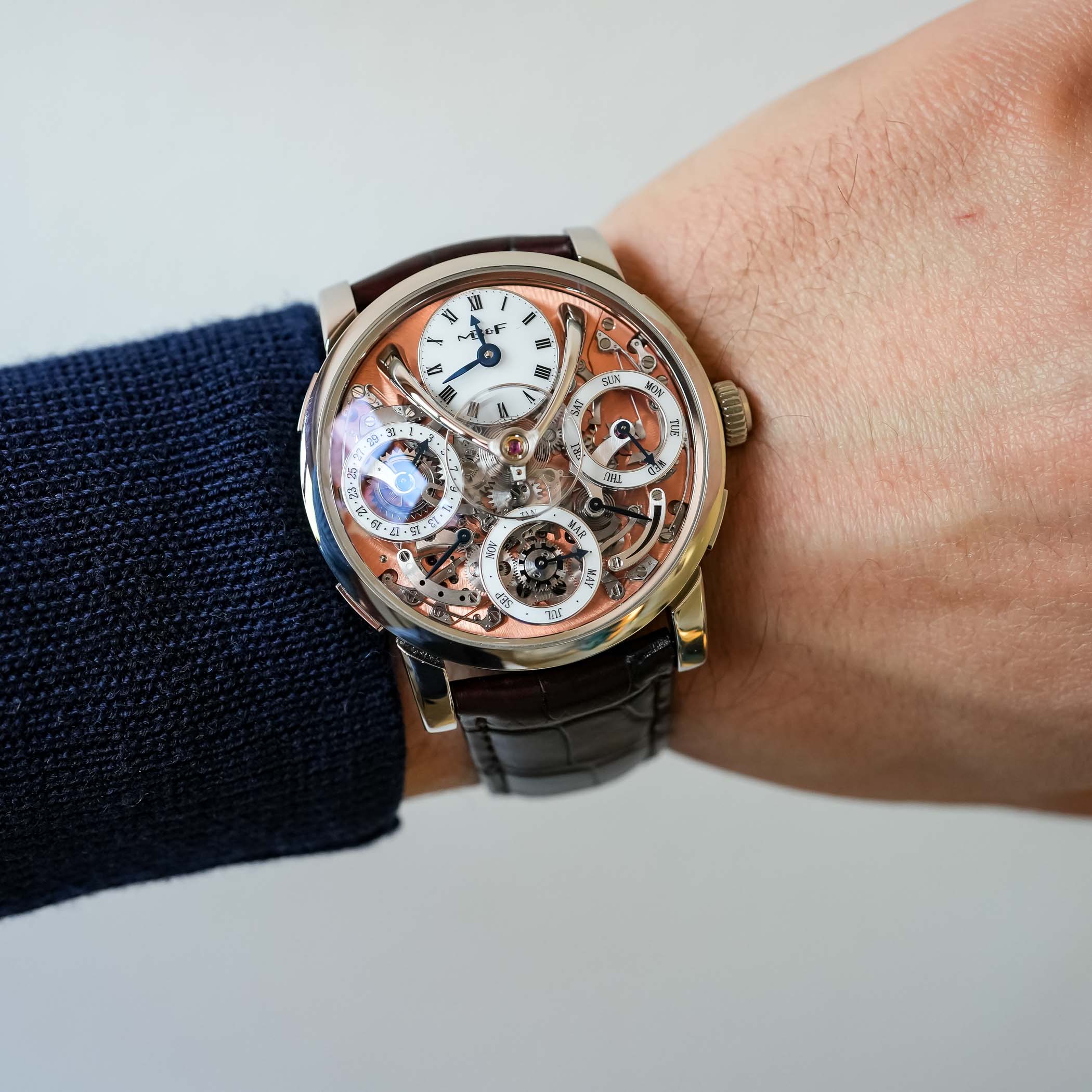 Quick facts – 44mm x 17.5mm – stainless steel case, brushed & polished – domed sapphire crystal, sapphire crystal caseback – salmon coloured baseplate with suspended subdials and blued hands – manually wound QP movement by Stephen McDonnell – 581 parts – 18,000vph – 72h power reserve – hours, minutes, day, date, month, leap year and power reserve indication – brown alligator leather strap with steel folding buckle – non-limited edition – EUR 172,000 (excl. taxes)