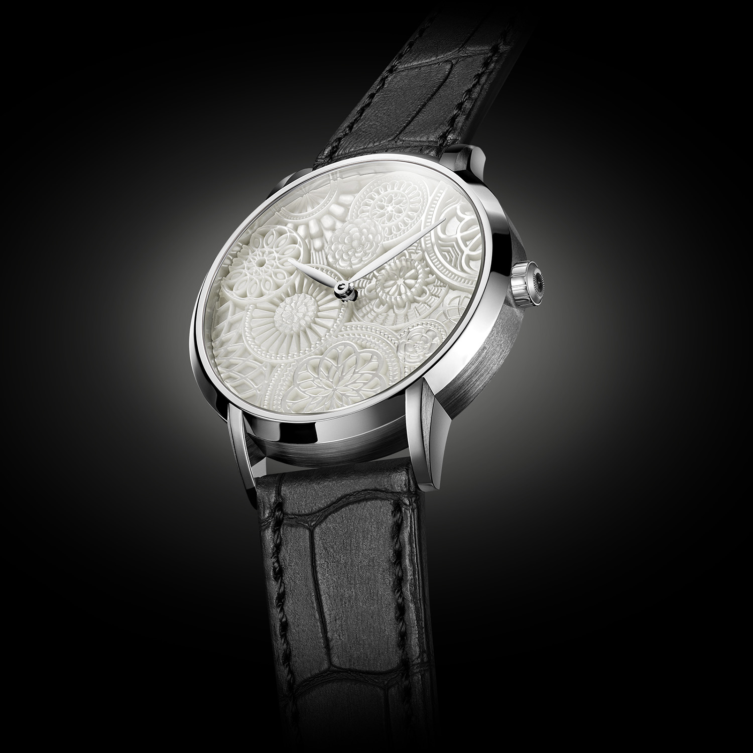 Quick facts – 38mm x 10mm – white or pink gold case, brushed & polished – sapphire crystal front & back – unique Métiers d’Art dials, handmade by Atelier Olivier Vaucher – leaf-shaped hour & minute hands – calibre VOP138, made by Telos – hand-engraved by Atelier Olivier Vaucher – automatic winding – 28,800vph – 72h power reserve – custom leather strap for each version – series of 7 unique pieces – prices ranging from CHF 110,000 to CHF 150,000