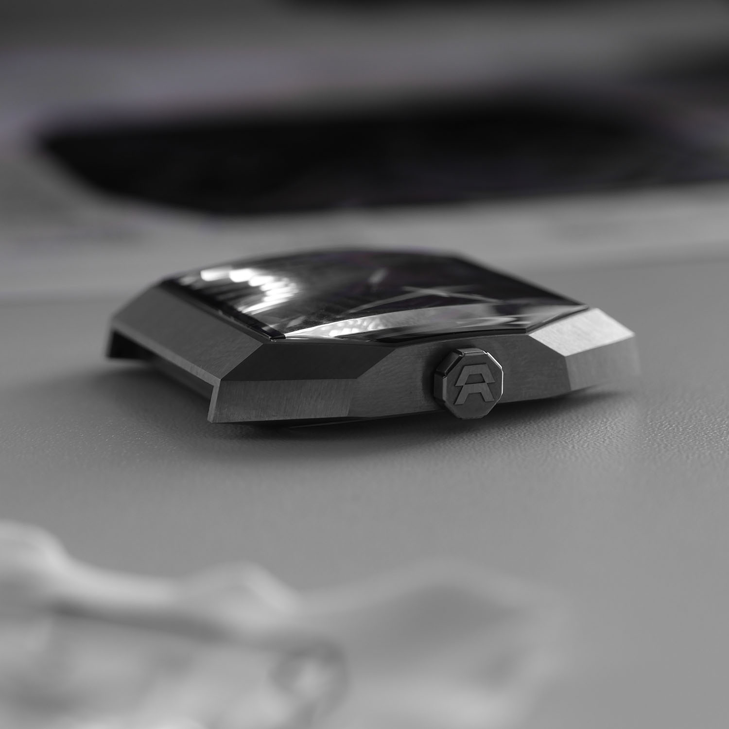 Quick Facts – 41mm width – wedge-shaped grade 5 titanium case, hand satin-finished – faceted sapphire crystal front & back – 40m water-resistant – matte bead-blasted dial – faceted hands with Super-LumiNova – A01 calibre, developed with Cercle des Horlogers – micro-rotor automatic – 28,800vph – 48h power reserve – counter-clockwise seconds hand – FKM rubber strap – limited to 25 numbered pieces – EUR 19,000