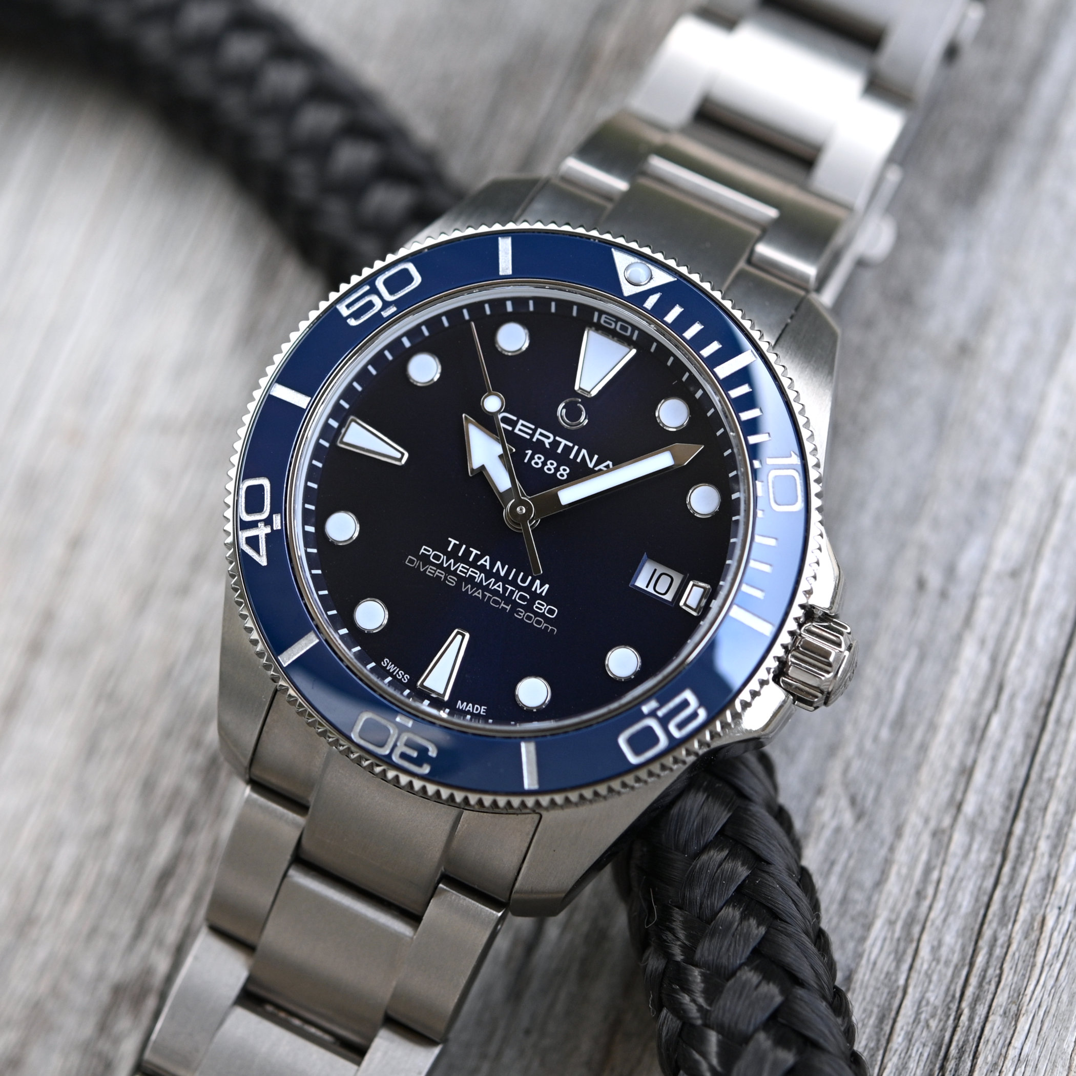 Quick Facts – 40.5mm x 14.10mm – stainless steel or titanium case, brushed & polished – unidirectional rotating bezel with ceramic insert – 300m water-resistance – sapphire crystal – solid caseback – black, blue or white dial – luminous markers & hands – Powermatic 80.611, automatic – anti-magnetic Nivachron hairspring – 21,600vph – 80h power reserve – two-tone textile strap or three-link bracelet with folding clasp – CHF 785 to CHF 895 (depending on material and strap/bracelet)