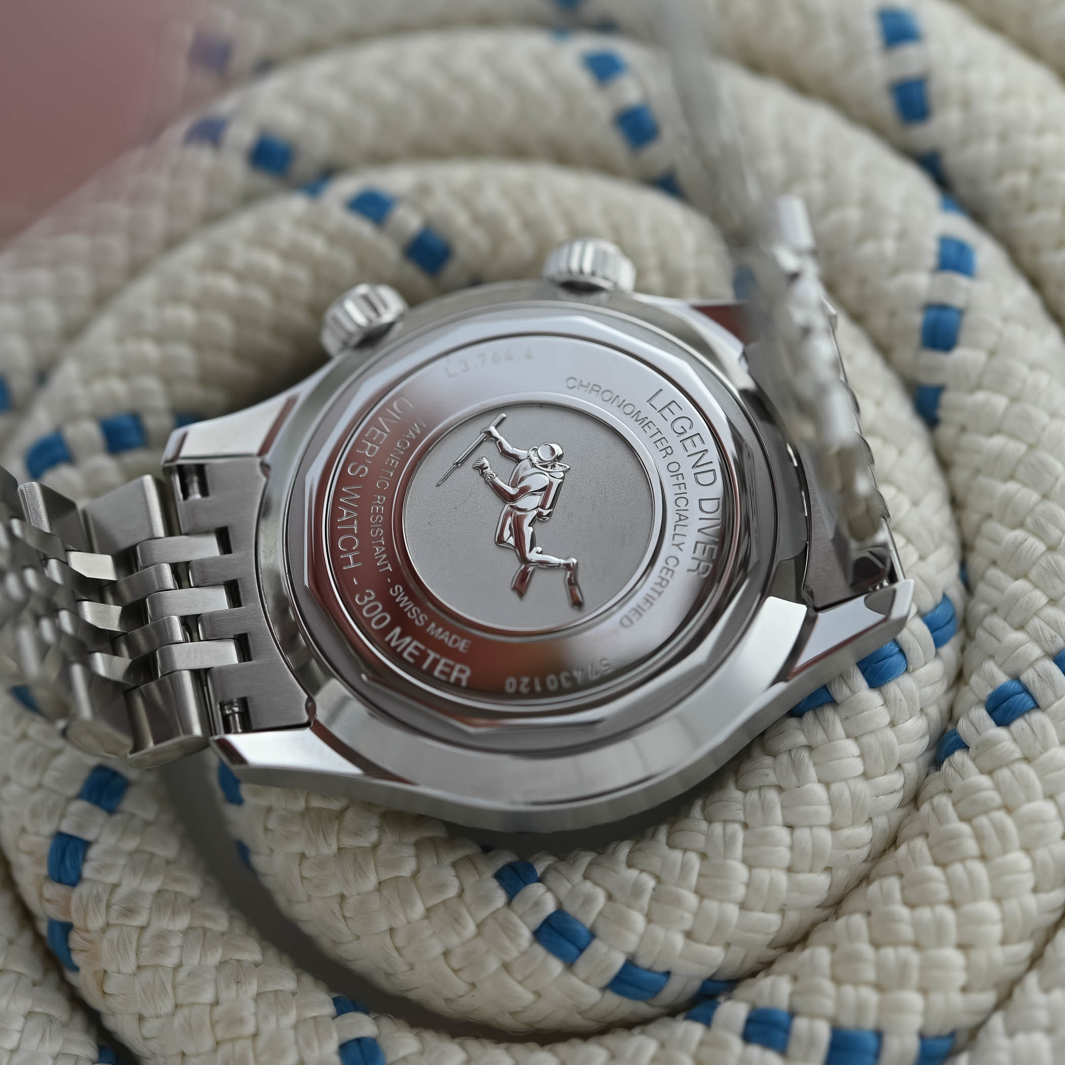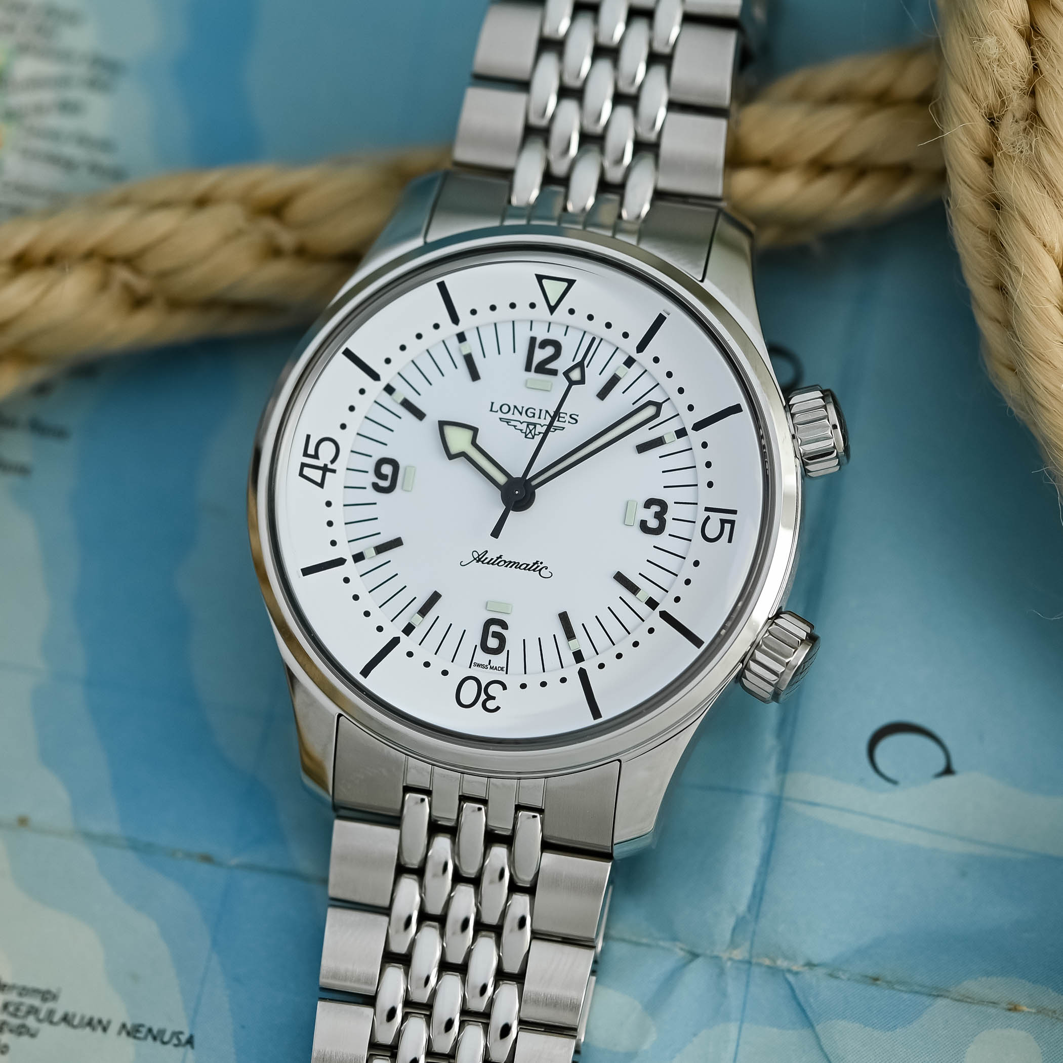 Quick Facts – 39mm x 12.7mm – stainless steel case, brushed & polished – compressor-style construction – dual crowns – sapphire crystal – solid caseback – 300m water-resistance – white dial with black markers, numerals and hands with SLN – crown-operated inner rotating bezel – calibre L888.6, automatic – 25,200vph – 72h power reserve – 7-row BoR bracelet with folding clasp – EUR 3,750