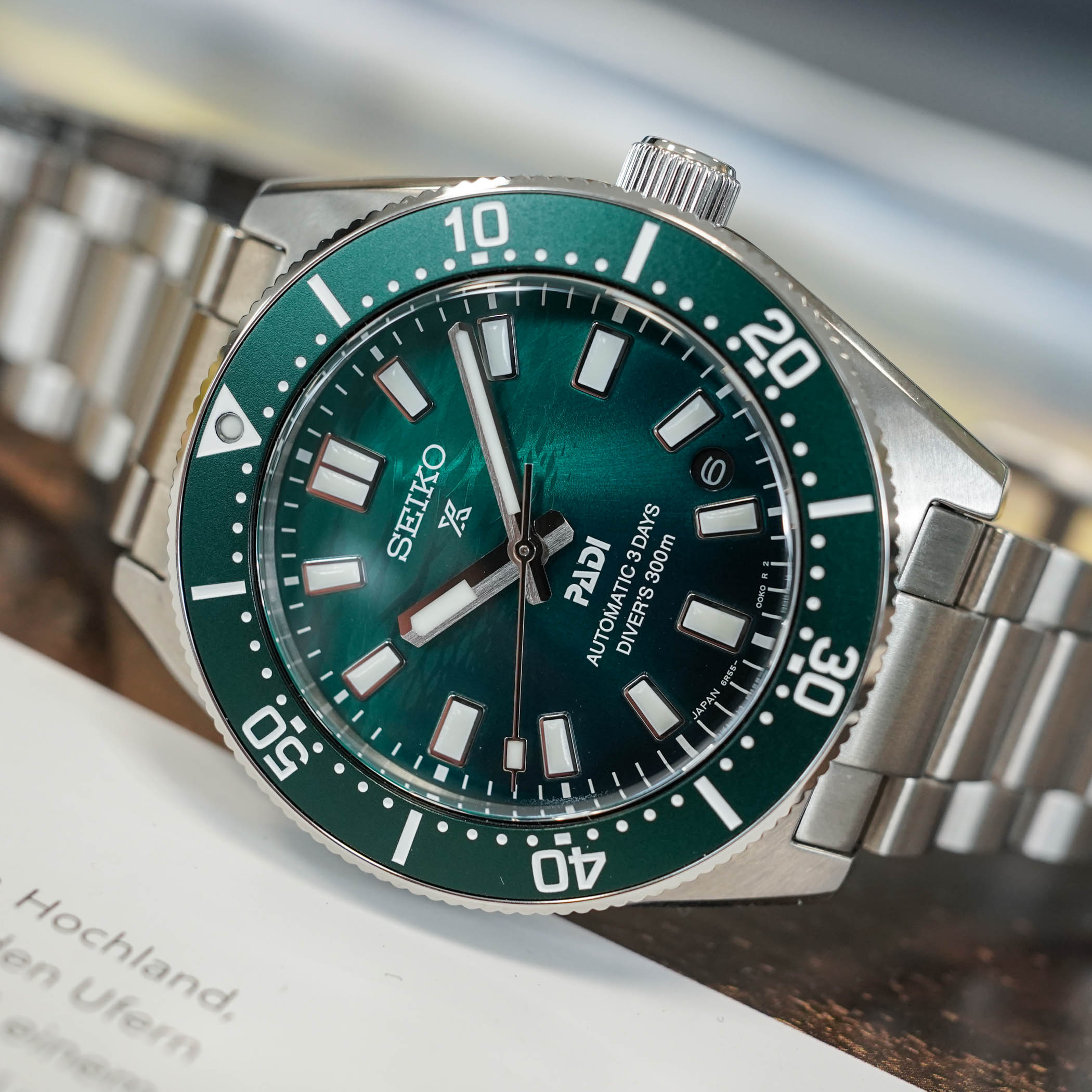 Quick Facts – 40mm x 13mm – 46.4mm lug-to-lug – stainless steel case, brushed & polished – sapphire crystal – solid caseback – unidirectional rotating bezel with green insert – screw-down crown – 300m water-resistance – green dial with wave patterns – LumiBrite markers & hands – calibre 6R55, in-house – automatic winding – 21,600vph – 72h power reserve – hours, minutes, (hacking) seconds, date – three-link steel bracelet with folding clasp – upcycled green nylon NATO-style strap – EUR 1,700