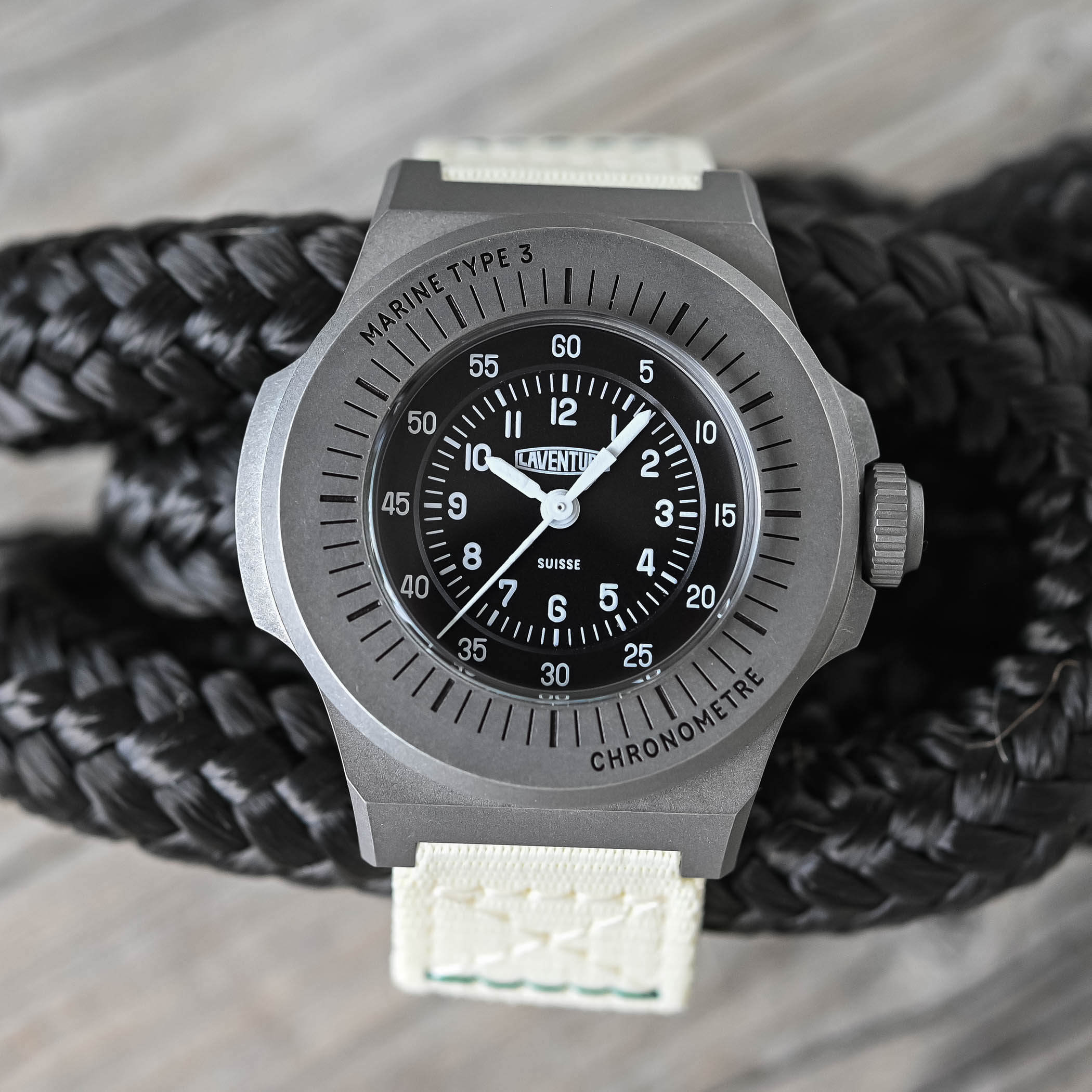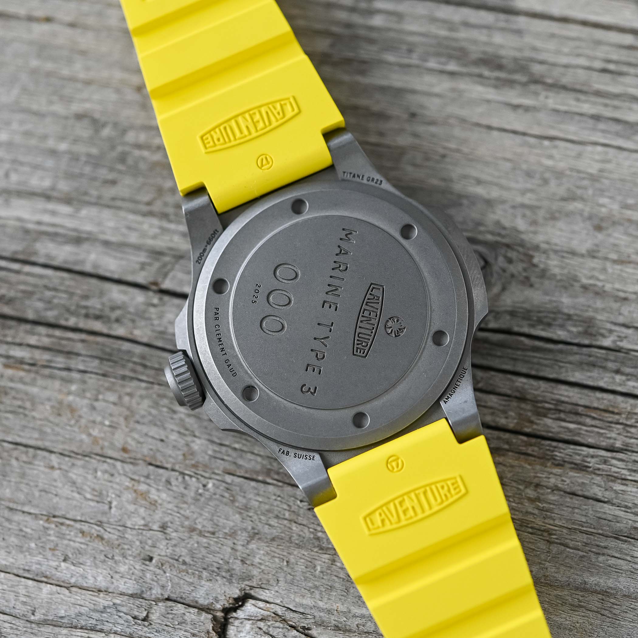 Rooted in the 1980s, in terms of inspiration at least, is Laventure’s latest dive watch, the Marine Type 3. The stoutly shaped diver has a full titanium case, with a very distinct profile. The broad bezel, sloping lug sections, protruding “bumpers” on either side and the relatively large crown give it plenty of character. It’s available with either a black dial with white luminous markings and hands, or a fully luminous white dial with black markings and hands. Power comes from calibre 4, based on the Sellita SW300 automatic, which is shielded from magnetism by a soft-iron inner case. It’s limited to 100 pieces per colour, with a range of strap options, for a price of CHF 4,200.