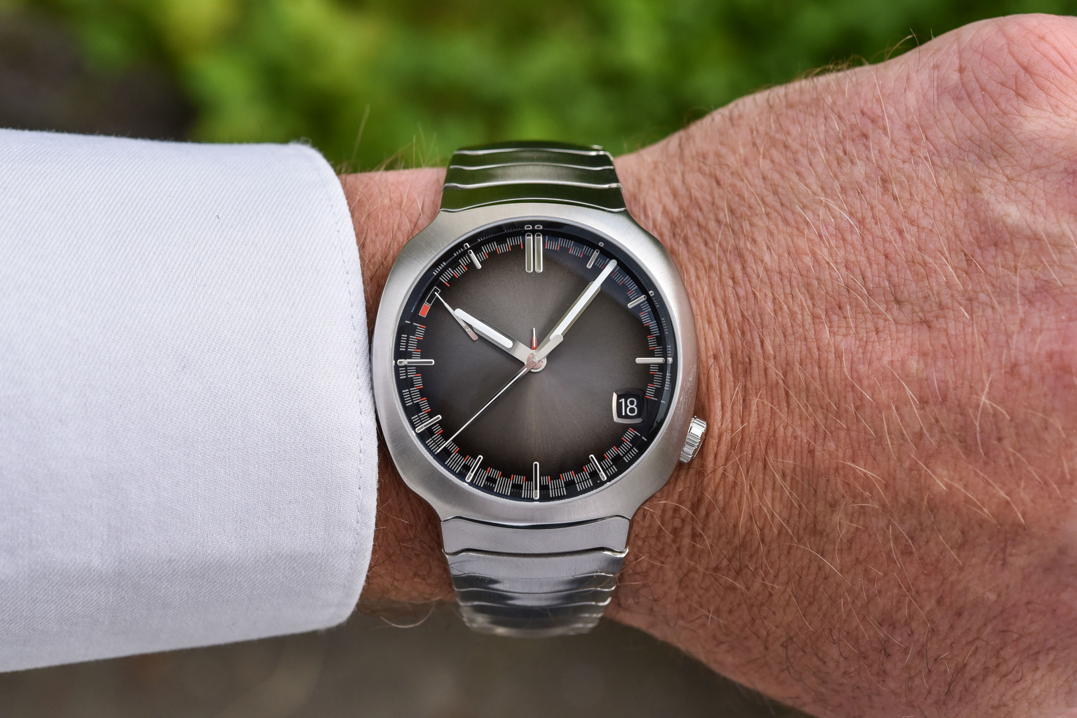 Quick Facts – 42.3mm diameter x 11mm height – stainless steel case with integrated bracelet, brushed and polished – domed box sapphire crystal, sapphire crystal backside – grey fumé dial with sunburst pattern – Calibre HMC 812, in-house – manual-winding – central hours and minutes, power reserve, date, month, leap year display on backside – 168h power reserve display at 10 o’clock – CHF 49,900