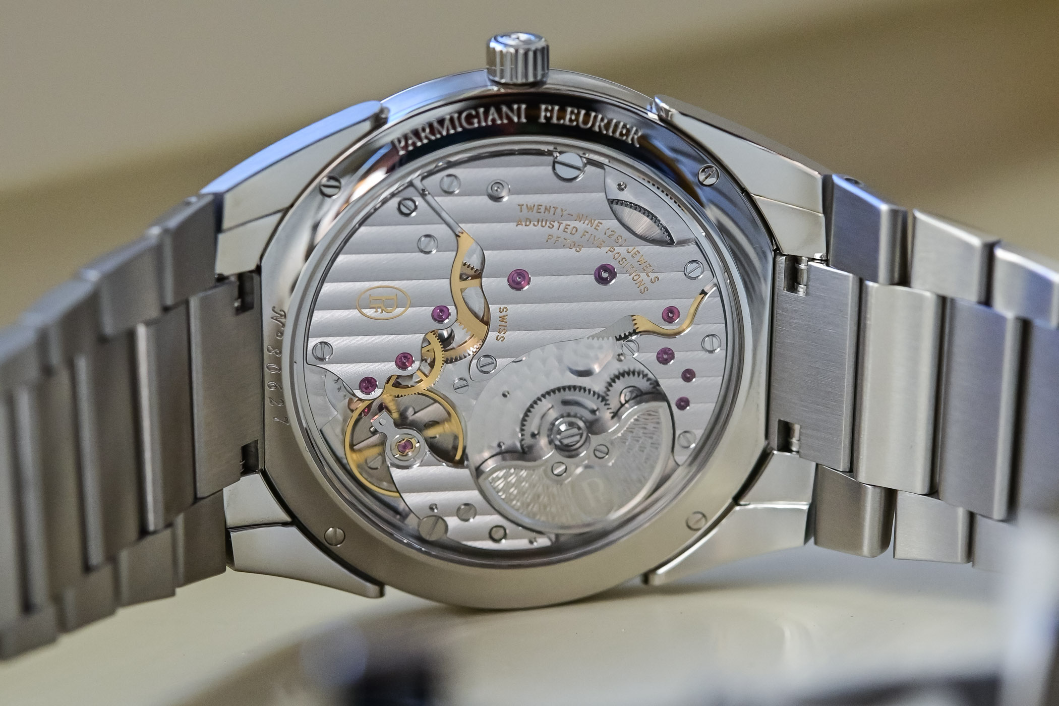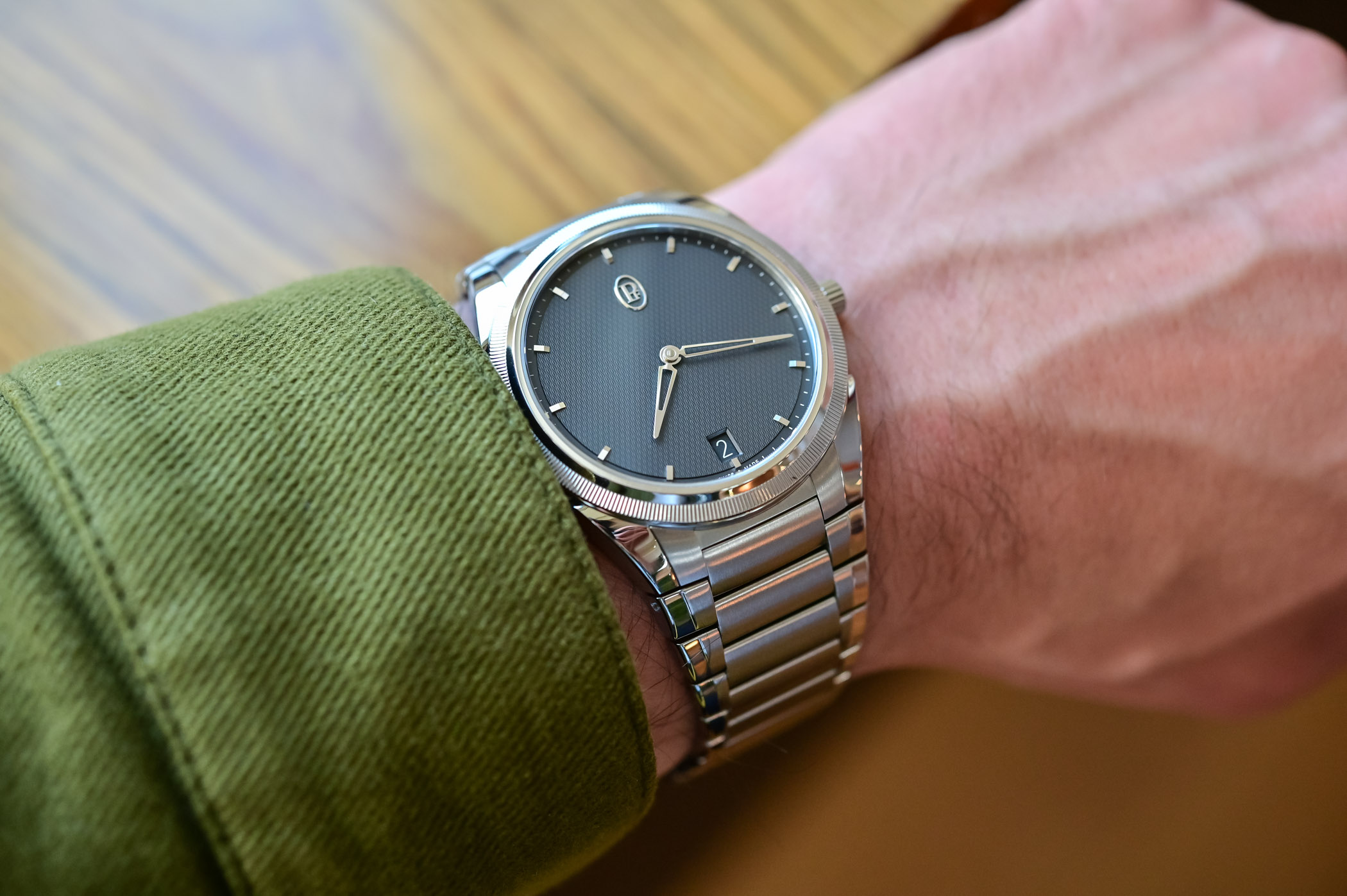 Quick Facts – 40mm diameter x 7.8mm height – stainless steel case, brushed with polished accents – teardrop-shaped lugs integrating the case and bracelet – platinum bezel – sapphire crystal front and back – grey dial with barleycorn guilloche – calibre PF703, in-house – automatic movement with platinum micro-rotor – 48h power reserve – EUR 21,000