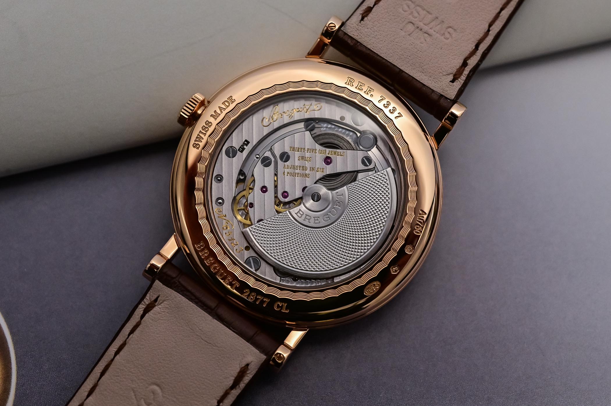 Quick Facts – 39mm x 9.95mm – rose or white gold case – sapphire crystal front and back – engine-turned hand-guilloché dial – Clous de Paris and barleycorn patterns – eccentric moon Breguet hands – off-centred calendar indications – Calibre 502.3 QSE1, in-house – automatic winding – 236 components – 35 jewels – flat balance-spring in anti-magnetic silicon – inverted straight-line lever escapement – 45h power reserve – hours, minutes, small seconds, moon phase, day and date – alligator strap with folding clasp – EUR 45,800