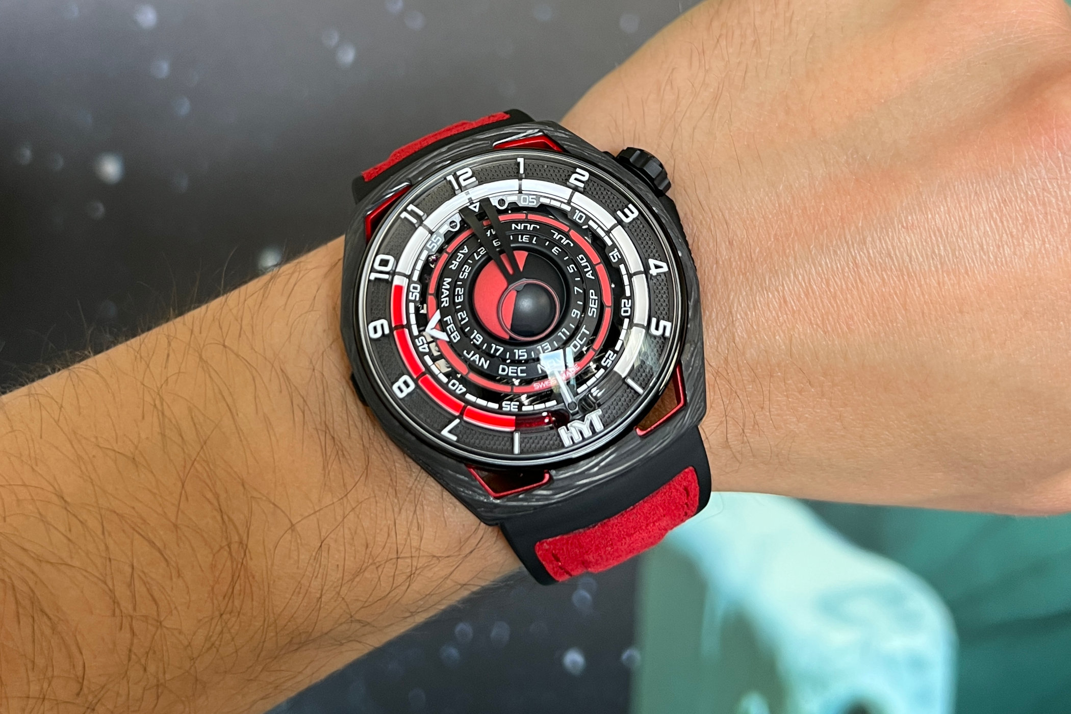 Quick Facts – 48mm x 21.80 – hydrocarbon and titanium case – titanium crown – domed box-shaped sapphire crystal – fluidic hour indication – applied luminescent Arabic hour indices – matte black minutes track with rotating hand on disc – months and days on two matte black rings – spherical moon phase indication – Calibre HYT 601-MO – manual winding – 41 jewels – 28,800vph – 72h power reserve – retrograde fluidic hours, minutes months, date, spherical moon with lunar phases – two-tone black rubber and Alcantara or white T-light rubber strap with titanium clasp – each one limited in production – CHF 120,000 (Red Magma, Supernova Blue) or CHF 130,000 (White Neon)