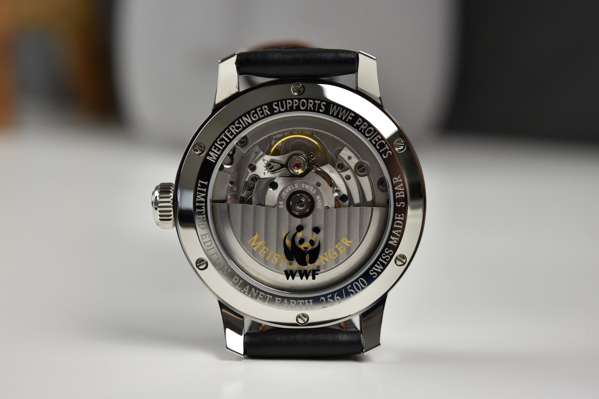 Quick Facts – 43mm x 11.5mm – stainless steel case – sapphire crystal front and back – 50m water-resistant – black dial with photorealistic print or planet Earth – peripheral timing track – double-digit hour numerals – single elongated white hand – exposed date wheel – Sellita SW 400-1, automatic – 26 jewels – 28,800vph – 38h power reserve – vegan leather strap with pin buckle – limited to 500 pieces – EUR 1,990 (EUR 200 per sold watch will be donated to WWF)