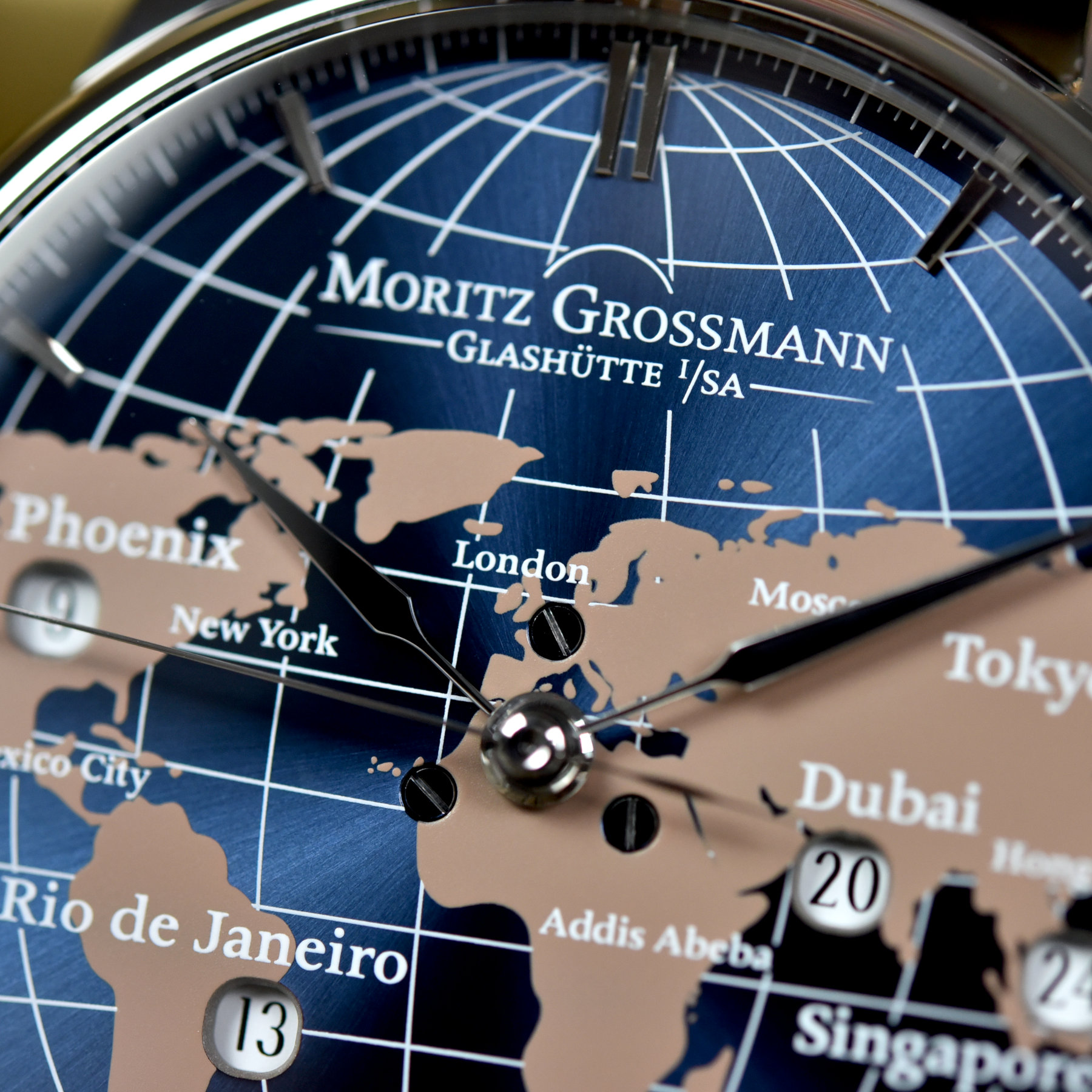 Quick Facts – 44.5mm x 13.78mm – stainless steel case – sapphire crystal front and back – crown and pusher for winding and setting – secondary crown for adjusting the hour disc – sunray-brushed blue dial with world map – beveled holes in six positions for additional time zones – central hour, minutes and seconds hands – applied hour markers – Calibre 100.7, manufacture – manual winding – 292 components – 31 jewels – 18,000vph 42h power reserve – chocolate brown alligator strap with pin buckle – EUR 42,000