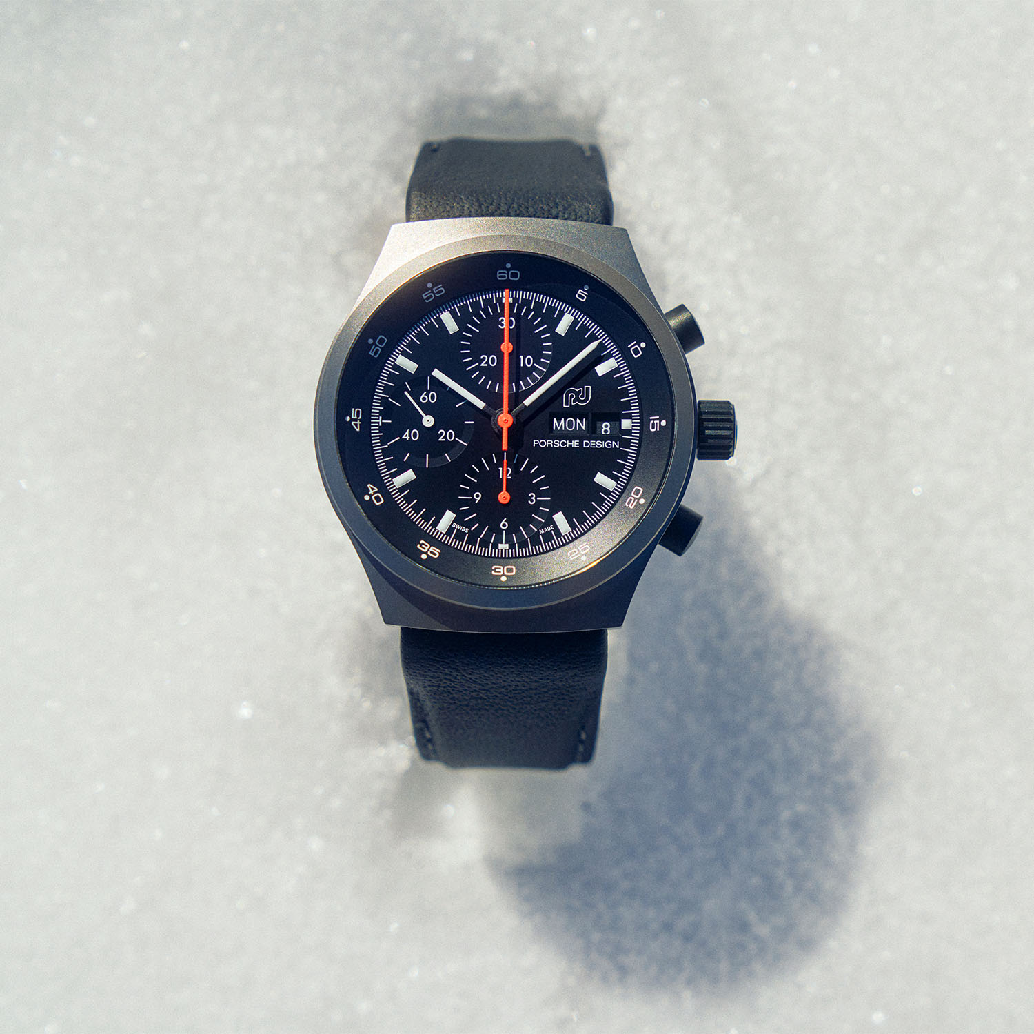 Quick Facts – 40.8mm x 14.15mm – bead-blasted titanium case – black pushers & crown – sapphire crystal – solid caseback – 100m dynamic water-resistant – matte black dial with white markings, indices and hands with Super-LumiNova – red chronograph seconds hand – date-date window – Porsche Design Calibre Werk 01.240, proprietary automatic flyback chronograph – 28,800vph – 38h power reserve – COSC-certified – white textile GP strap with additional black leather strap – limited to 250 pieces – EUR 8,950